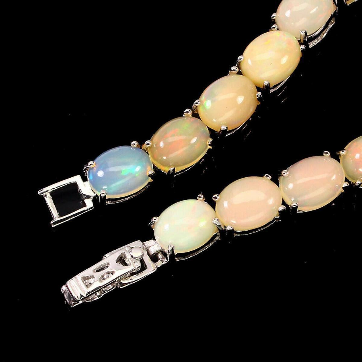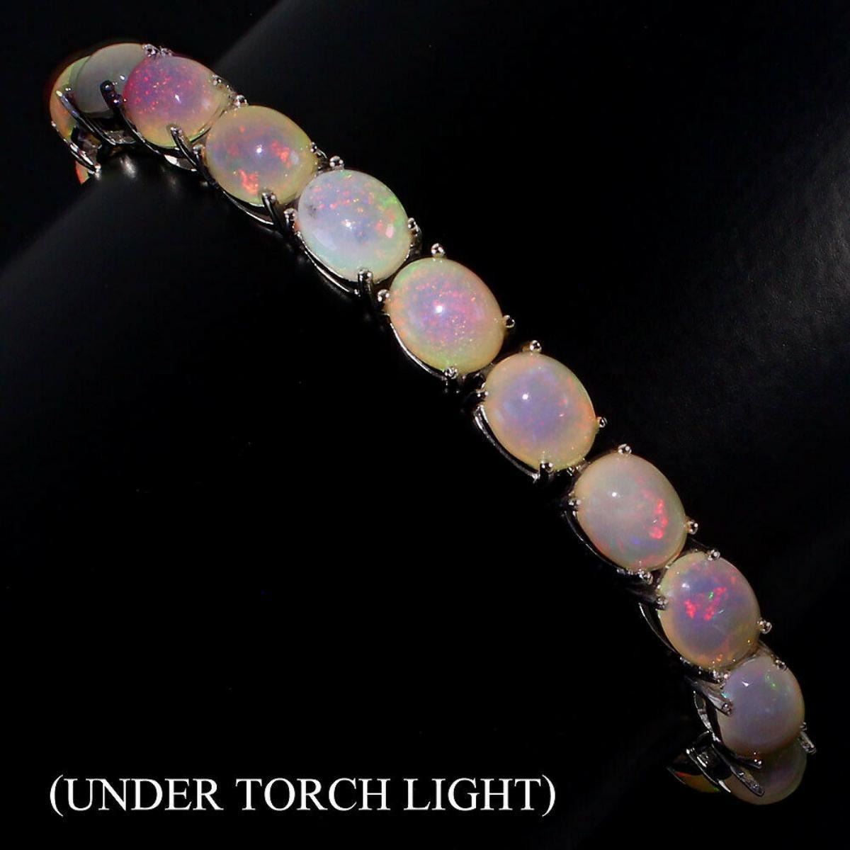 925 STERLING SILVER;PLATE-14K WHITE GOLD;LENGTH (INCHES)-8.5;MAIN STONE-FIRE OPAL;TOTAL WEIGHT-94.30 CT (TOTAL WEIGHT OF SILVER + STONE)DIMENSION* STONE 9.0 X 7.0 MM. * FACE BRACELET 180.0 X 7.0 MM.MAIN STONE SHAPE-OVAL CABOCHON;MAIN STONE COLOR-RAINBOW FULL FLASH;CLARITY/GRADE-TRANSPARENT;TREATMENT-UNHEATED;ORIGIN-ETHIOPIA;HARDNESS-5.5 - 6.5;
