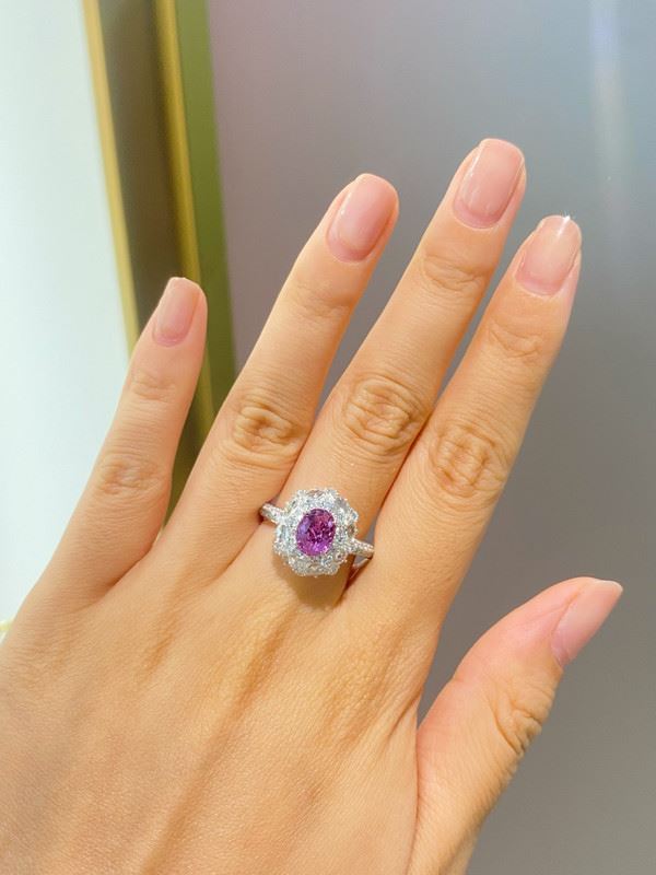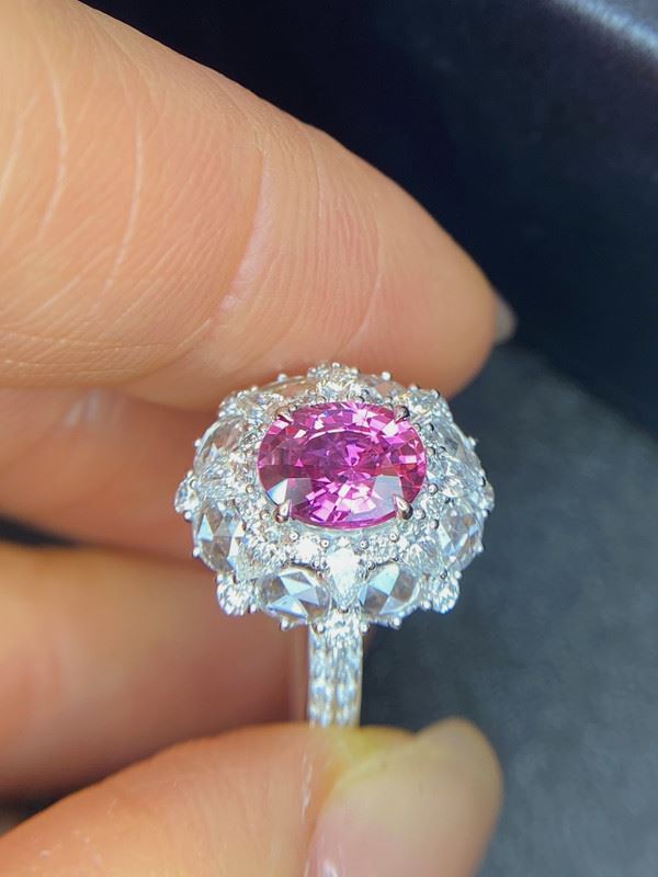 A natural unheated padparadscha sapphire with a soft pink-orange hue, accented by diamonds in a white-metal setting—luminous, delicate, and versatile.Ring size: 6, circumference: 52 mm, diameter: 16.6 mm, main diamond: 1.27 ct, side diamonds: 1.258 ct. Note: Comes with a GUILD certificate.