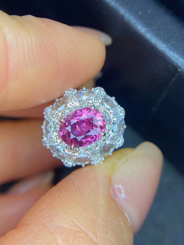 A natural unheated padparadscha sapphire with a soft pink-orange hue, accented by diamonds in a white-metal setting—luminous, delicate, and versatile.Ring size: 6, circumference: 52 mm, diameter: 16.6 mm, main diamond: 1.27 ct, side diamonds: 1.258 ct. Note: Comes with a GUILD certificate.