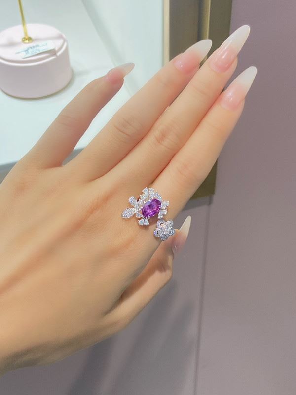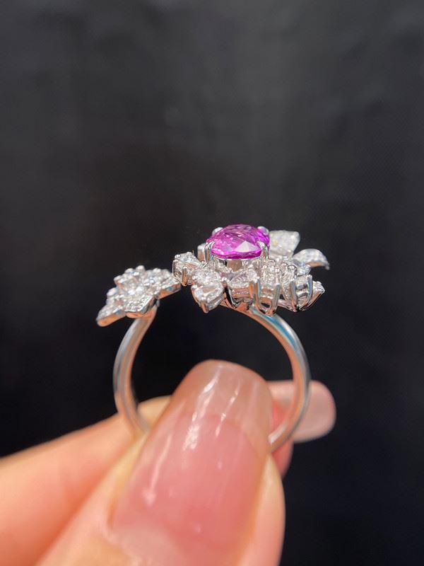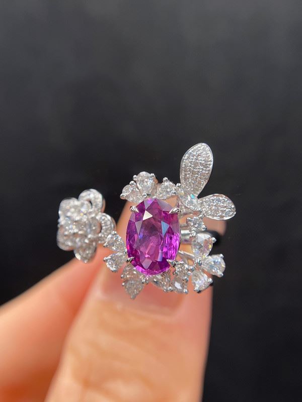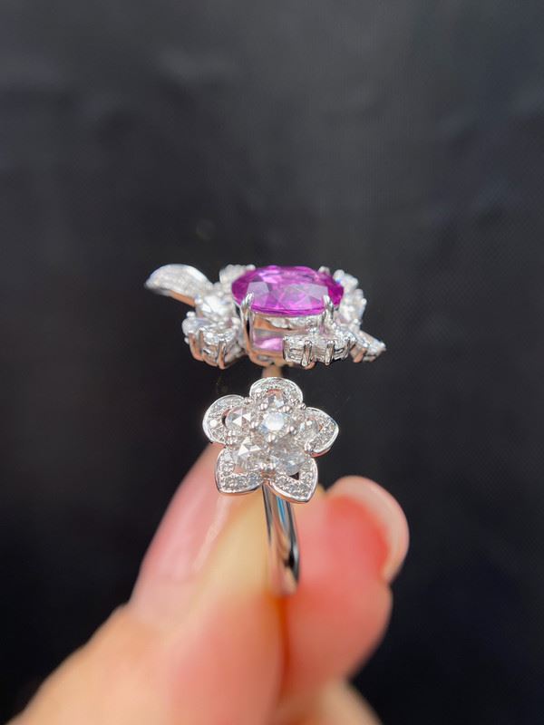 A natural, unheated pink sapphire in an oval cut shimmers at the center, framed by an open ring design with diamond flowers and butterfly-like accents. The asymmetrical style feels lively and romantic, adding a touch of refined sweetness to the hand.Ring size: 6, circumference: 52 mm, diameter: 16.6 mm, Main stone: 1.80ct, side diamonds: 0.903ct. Note: Comes with a GIC certificate.