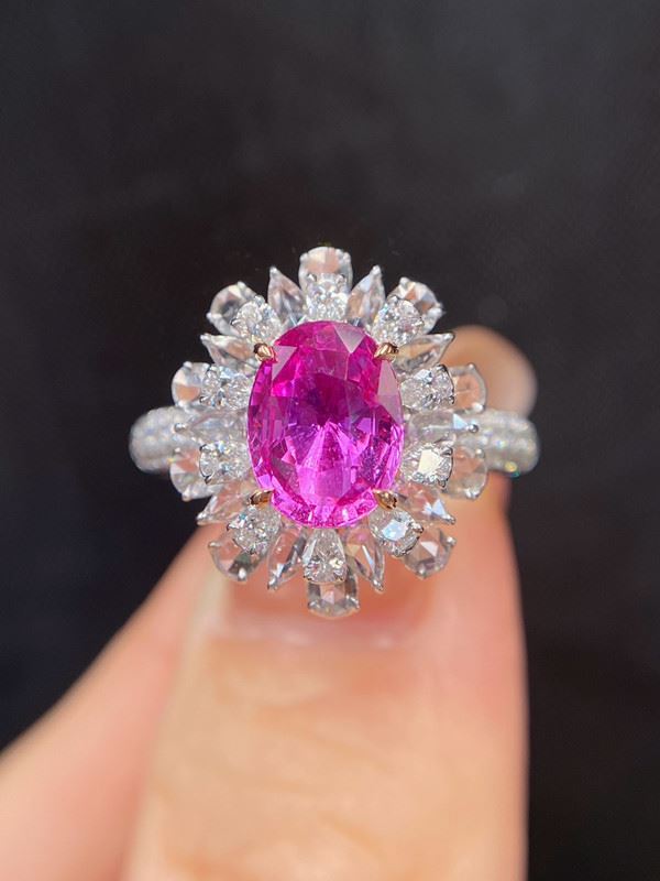 This natural unheated pink sapphire ring features a brilliant pink sapphire at the center, surrounded by delicate diamonds in a floral design, combining romance and luxury. The fresh hue of the pink sapphire contrasts beautifully with the sparkle of the diamonds, and the golden band enhances the gemstone’s beauty, perfectly showcasing the wearer’s noble and elegant style.Ring size: 6, circumference: 52 mm, diameter: 16.6 mm, main diamond: 2.02 ct, side diamonds: 1.098 ct.