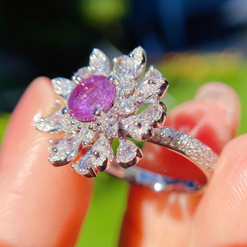 This natural unheated pink sapphire ring features a captivating pink sapphire at its center, surrounded by beautiful pear-shaped diamonds arranged like blooming petals. The soft hue of the pink sapphire contrasts beautifully with the dazzling brilliance of the diamonds, creating a perfect blend of elegance and luxury. The refined design makes it a versatile piece for any occasion, showcasing feminine grace and sophistication.Ring size: 6, circumference: 52 mm, diameter: 16.6 mm. S:1.12ct d:1.39ct. Note: Comes with an RGL Gemstone Authentication Report.