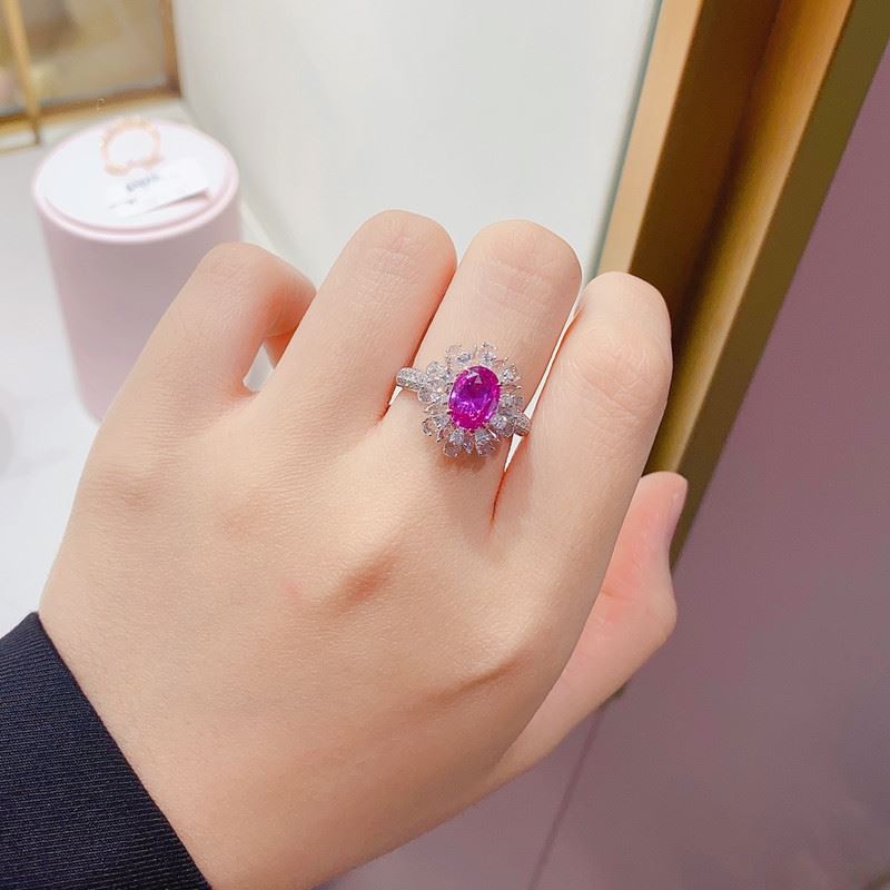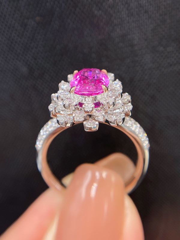 This natural unheated pink sapphire ring features a brilliant pink sapphire at the center, surrounded by delicate diamonds in a floral design, combining romance and luxury. The fresh hue of the pink sapphire contrasts beautifully with the sparkle of the diamonds, and the golden band enhances the gemstone’s beauty, perfectly showcasing the wearer’s noble and elegant style.Ring size: 6, circumference: 52 mm, diameter: 16.6 mm, main diamond: 2.02 ct, side diamonds: 1.098 ct.Note: Comes with a EGLab certificate.