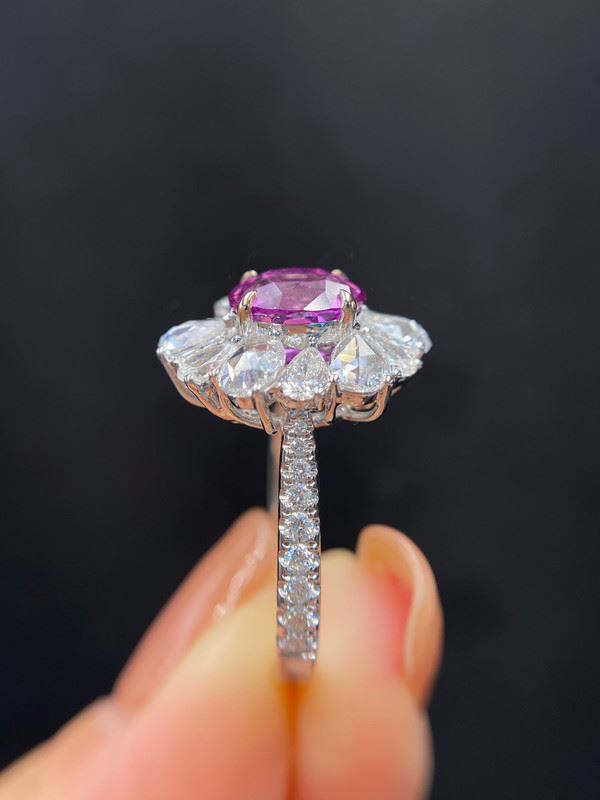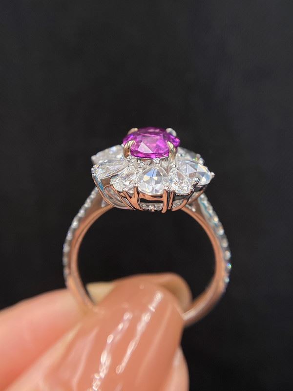 This natural unheated pink sapphire ring features a vibrant pink sapphire at its center, surrounded by delicate pear-shaped diamonds that form a stunning flower design. The soft hue of the pink sapphire contrasts beautifully with the brilliance of the diamonds, creating a luxurious and elegant combination. The straight band design adds a modern touch, making this ring a perfect symbol of grace and refined taste.Ring size: 6, circumference: 52 mm, diameter: 16.6 mm, main diamond: 2.01 ct, side diamonds: 1.659 ct.Note: Comes with an EGLab certificate.