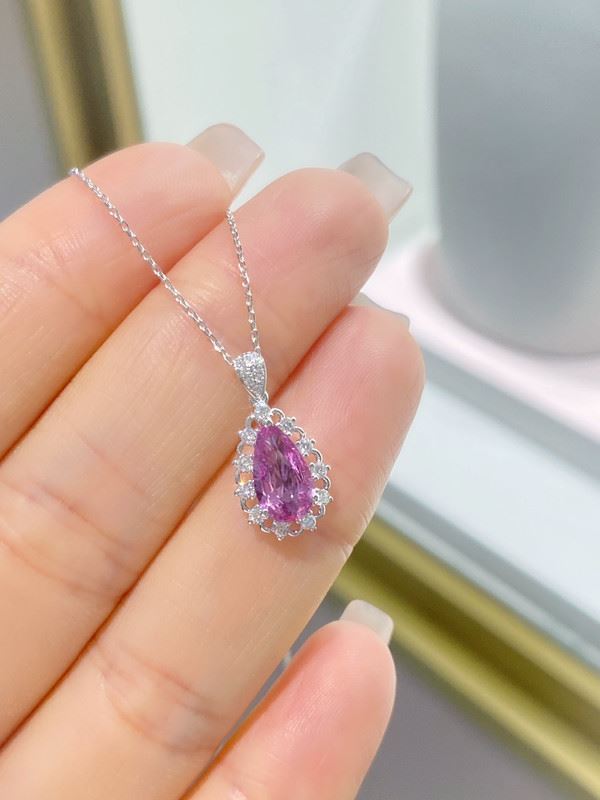 This natural unheated pink sapphire teardrop necklace features a pear-shaped pink sapphire at the center, surrounded by sparkling diamonds, creating an elegant and minimalist design. The soft hue of the pink sapphire beautifully complements the purity of the diamonds, highlighting the wearer’s grace and noble charm. Exquisitely crafted, this necklace is perfect for both everyday wear and special occasions, offering understated luxury.m Main diamond: 1.17 ct, side diamonds: 0.188 ct.Note: Comes with a GUILD certificate.