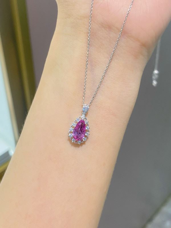 This natural unheated pink sapphire teardrop necklace features a pear-shaped pink sapphire at the center, surrounded by sparkling diamonds, creating an elegant and minimalist design. The soft hue of the pink sapphire beautifully complements the purity of the diamonds, highlighting the wearer’s grace and noble charm. Exquisitely crafted, this necklace is perfect for both everyday wear and special occasions, offering understated luxury.m Main diamond: 1.17 ct, side diamonds: 0.188 ct.Note: Comes with a GUILD certificate.