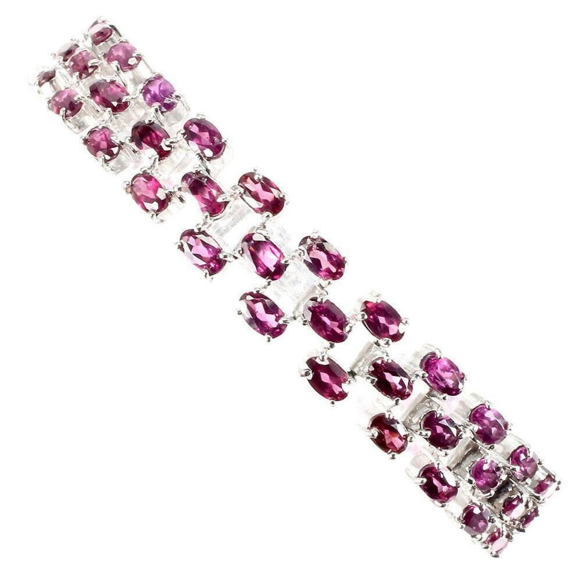 925 STERLING SILVER;PLATE-14K WHITE GOLD;LENGTH (INCHES)7.5;MAIN STONE-RHODOLITE GARNET;TOTAL WEIGHT-20.29 GRAM (TOTAL WEIGHT OF SILVER + STONE)DIMENSION-* STONE 5.0 X 3.0 MM. * TOTAL LENGTH 7.5 INCHES. * FACE BRACELET -170.0 X 10.0 MM.;MAIN STONE SHAPE-OVAL CUT;MAIN STONE COLOR-TOP RICH PINK RASPBERRY;CLARITY/GRADE-IF TO VVS;TREATMENT-UNHEATED;ORIGIN-AFRICA;HARDNESS-7;