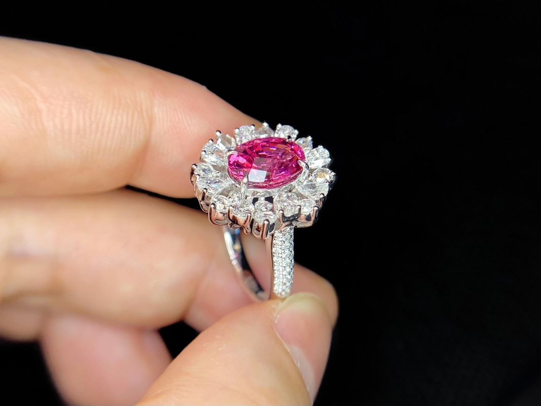 This natural unheated spinel ring features a vivid pink spinel as its centerpiece, showcasing a pure and natural beauty without any heat treatment. The gemstone is surrounded by brilliant white diamonds arranged in a floral-inspired design, creating a luxurious and radiant effect. The band is delicately set with diamonds, highlighting fine craftsmanship and elegance. Perfect for both daily wear and special occasions, this ring exudes confidence and sophistication.Ring size: 6, circumference: 52 mm, diameter: 16.6 mm, S:3.01ct d:1.829ct.