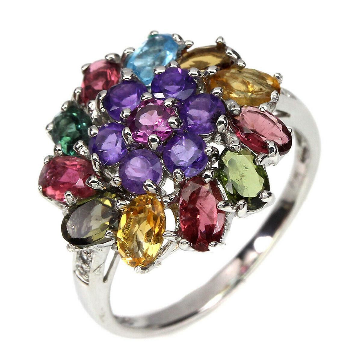 925 STERLING SILVER;PLATE-14K WHITE GOLD;RING SIZE-8(RESIZABLE);MAIN STONE-TOURMALINE;OTHER GEMS-AMETHYST, RHODOLITE GARNET, WHITE TOPAZ;TOTAL WEIGHT-3.41 GRAM (TOTAL WEIGHT OF SILVER + STONE);DIMENSION-* STONE 1.0 TO 5.0 X 3.0 MM. * RING SIZE 8.0 * FACE RING 20.0 X 18.0 MM.;MAIN STONE SHAPE-OVAL CUT;MAIN STONE COLOR-MULTI-COLOR;CLARITY/GRADE-IF TO VVS;TREATMENT-UNHEATED;ORIGIN-BRAZIL;HARDNESS-7;