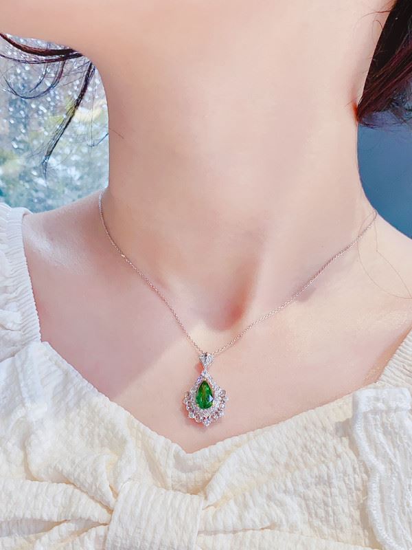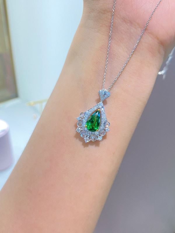 A natural unheated tsavorite gemstone in a vivid green teardrop cut sits at the center, encircled by sparkling diamonds in a floral-inspired halo. The elegant pendant design radiates sophistication and the brilliance of nature.Main stone: 1.67ct, side diamonds: 0.697ct. Note: Comes with a GUILD certificate.
