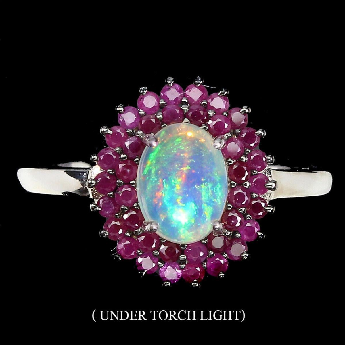 925 STERLING SILVER;PLATE-2-TONE BLACK RHODIUM & WHITE 14K GOLD;RING SIZE--8(Resizeable);MAIN STONE-White OPAL;OTHER GEMS-RUBY;TOTAL WEIGHT-3.34 GRAM (TOTAL WEIGHT OF SILVER + STONE)DIMENSION* STONE 1.5 TO 8.0 X 6.0 MM. * RING SIZE 8.0 * FACE RING -14.0 X 13.0 MM.;MAIN STONE SHAPE-OVAL CABOCHON;MAIN STONE COLOR-MULTI-COLOR;TREATMENT-UNHEATED;ORIGIN-ETHIOPIA;HARDNESS-5.5 - 9.0;