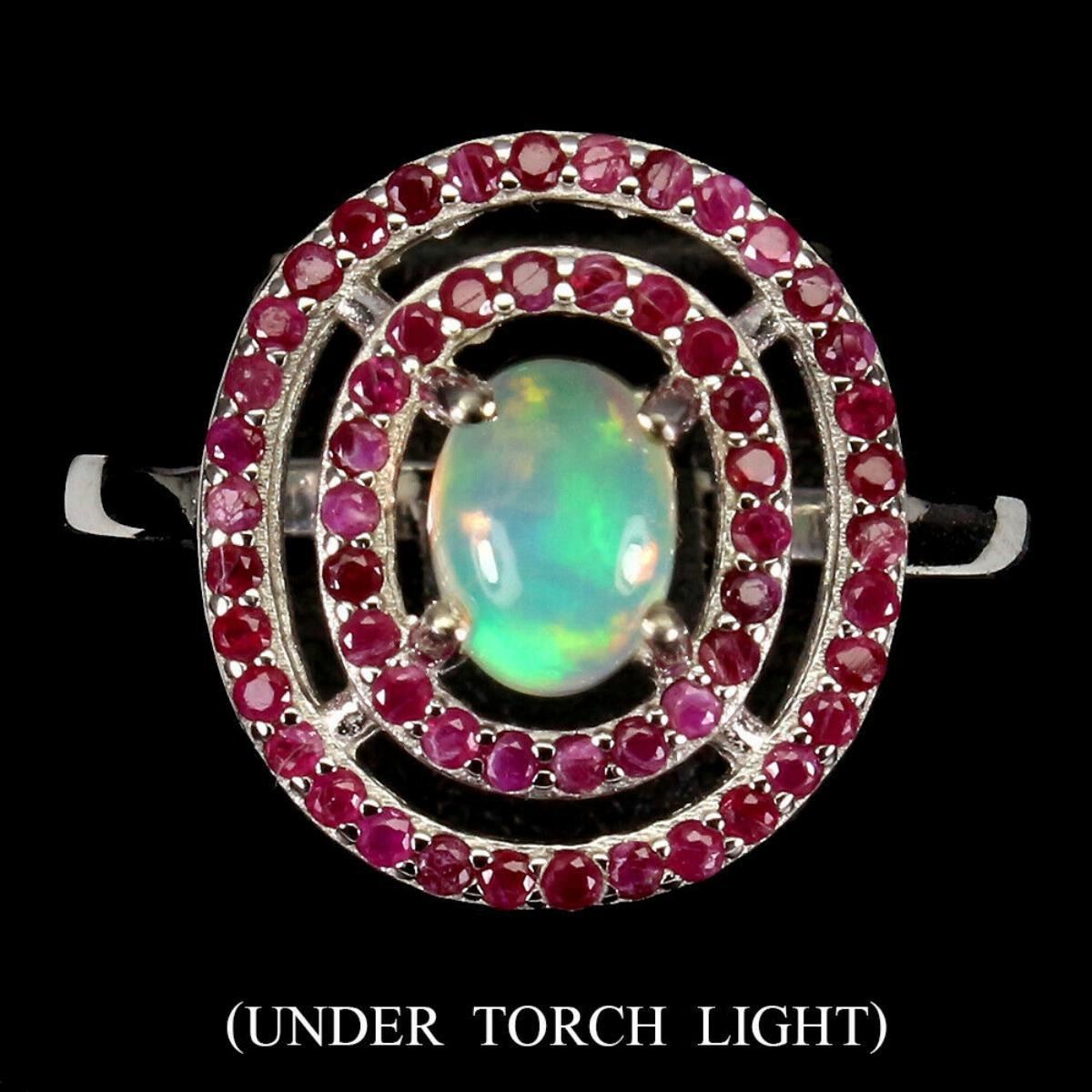 925 STERLING SILVER;PLATE-14K WHITE GOLD;RING SIZE-9 (Resizeable);MAIN STONE-FIRE OPAL;OTHER GEMS-RUBY;TOTAL WEIGHT-3.61 GRAM (TOTAL WEIGHT OF SILVER + STONE)DIMENSION-* STONE 1.5 TO 7.0 X 5.0 MM. * RING SIZE 9.0 * FACE RING 17.0 X 15.0 MM.;MAIN STONE SHAPE-OVAL CABOCHON;MAIN STONE COLOR-RAINBOW FULL FLASH;TREATMENT-UNHEATED;ORIGIN-ETHIOPIA;