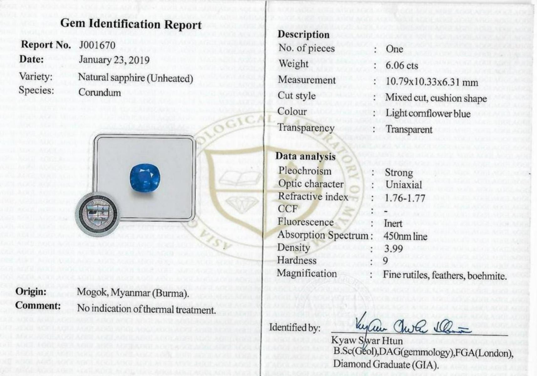 Natural Untreated Burma Cornflower Blue Sapphire 6.06 Carats.....very soothing cornflower Blue color....cushion cut.....size 10.79 x 10.33 x 6.31 MM. completely untreated ....Origin - Burma