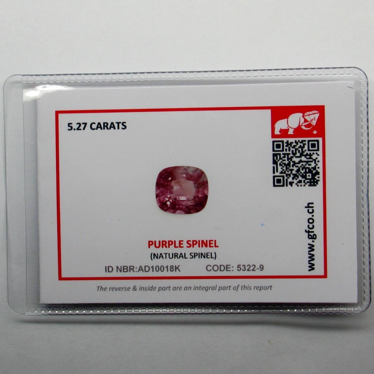 Natural Untreated Burma Purple Spinel - Certified; SHAPE Classic Cushion; WEIGHT 5.27 Ct. SIZE 10.72 X 10.07 X 6.2 mm QUANTITY 1 Piece COLOR Purple Pink CLARITY SI LUSTER Superior ORIGIN Myanmar/Burma; TREATMENT None HARDNESS 8