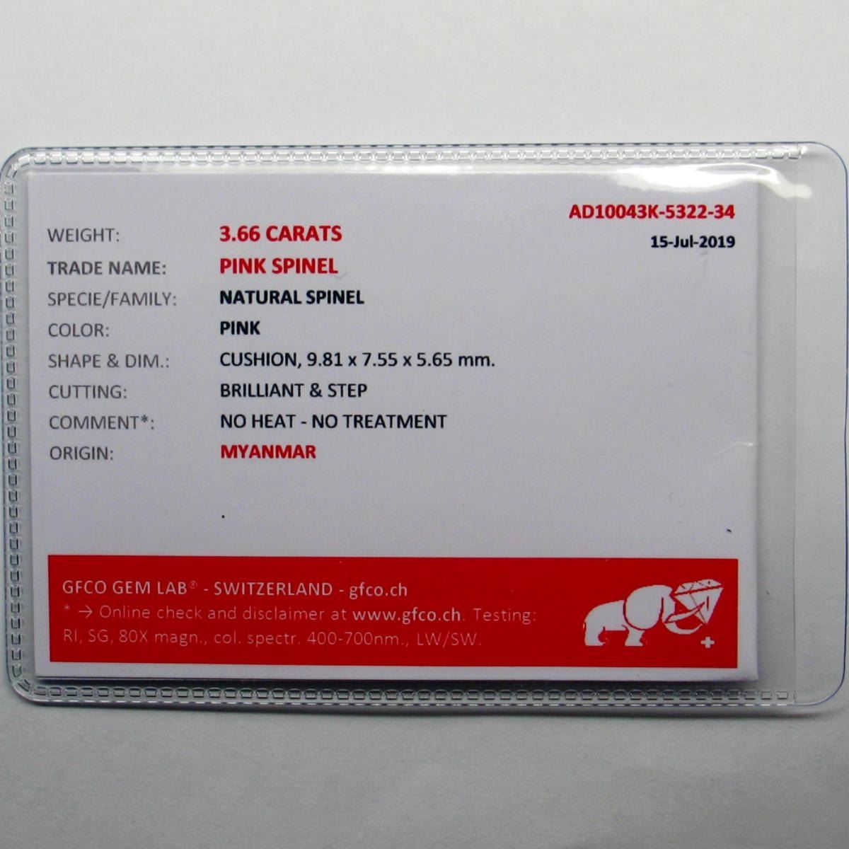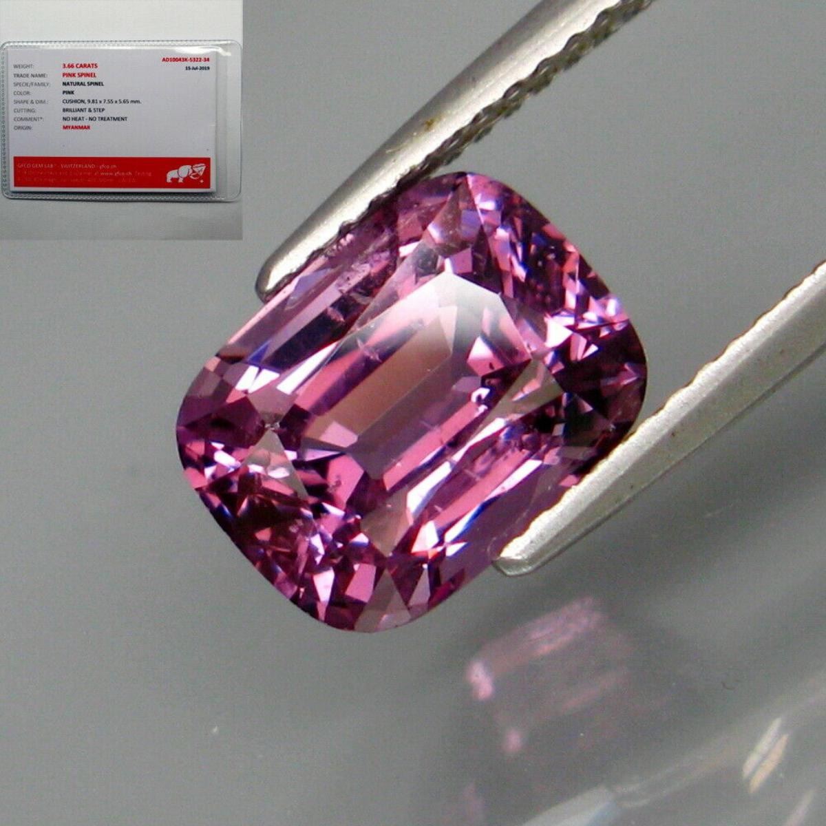 Natural Untreated Burma Purple Spinel - Certified; SHAPE Classic Cushion WEIGHT 3.66 Ct. SIZE 9.81 X 7.55 X 5.65 mm QUANTITY 1 Piece COLOR Purple Pink CLARITY VS; LUSTER Superior ORIGIN Myanmar TREATMENT None HARDNESS 8