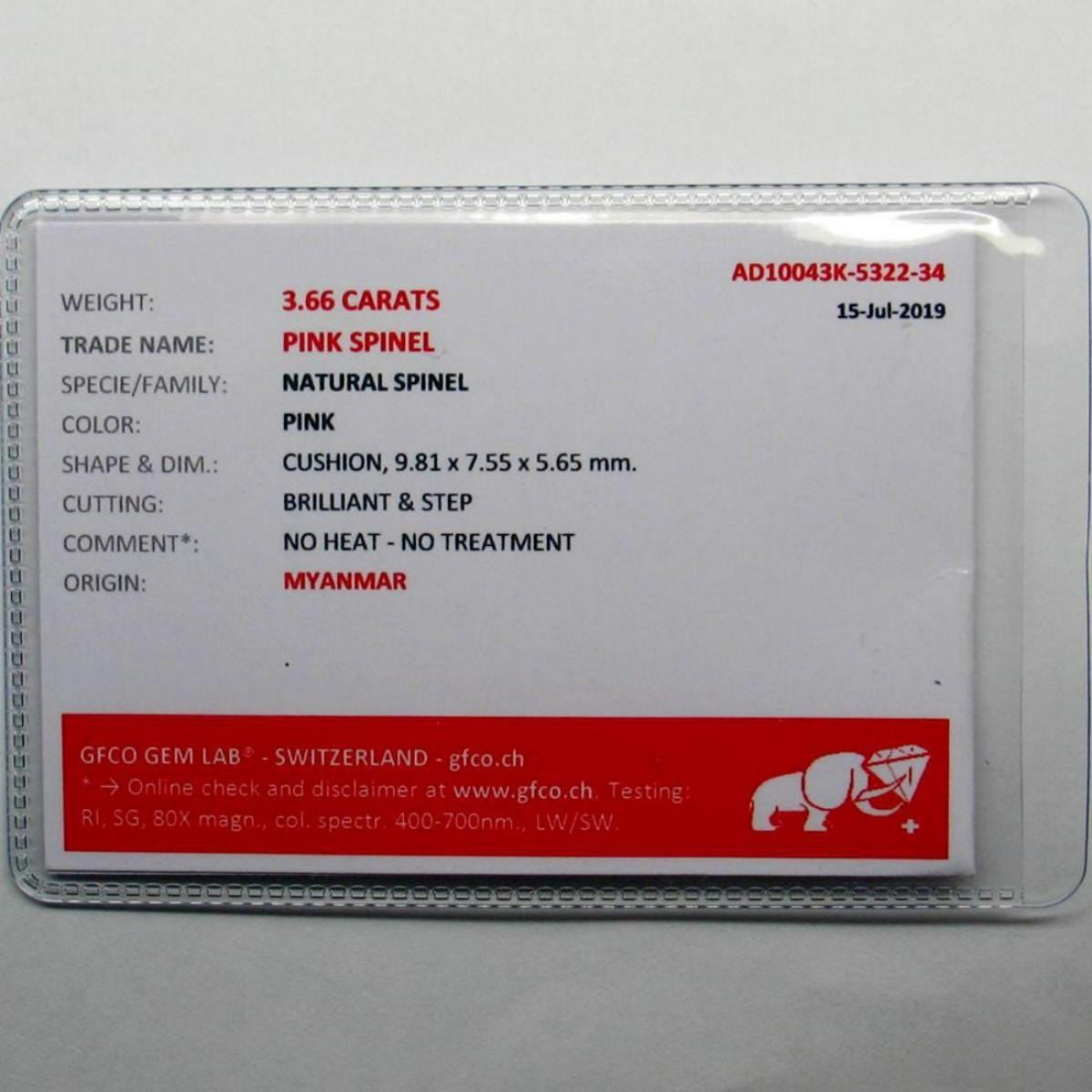 Natural Untreated Burma Purple Spinel - Certified; SHAPE Classic Cushion WEIGHT 3.66 Ct. SIZE 9.81 X 7.55 X 5.65 mm QUANTITY 1 Piece COLOR Purple Pink CLARITY VS; LUSTER Superior ORIGIN Myanmar TREATMENT None HARDNESS 8