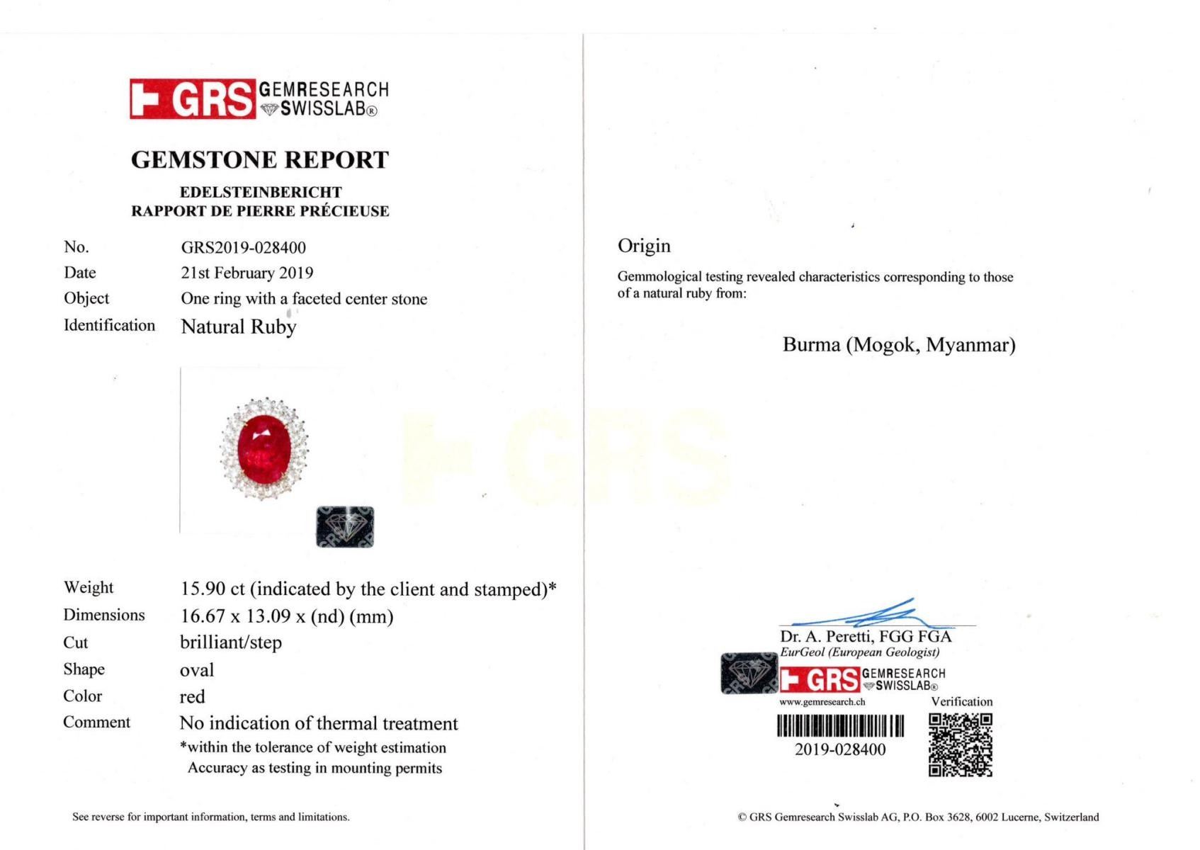 Natural Red Ruby Burma Origin 15.90 Cts - GRS Certified.....shape - Oval......Clarity - SI....Color - Certified Red Color By GRS Lab....Origin - Burma