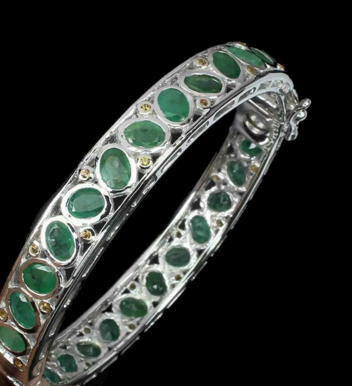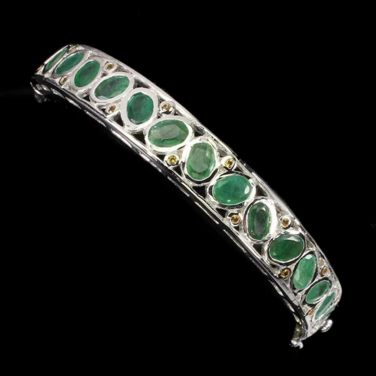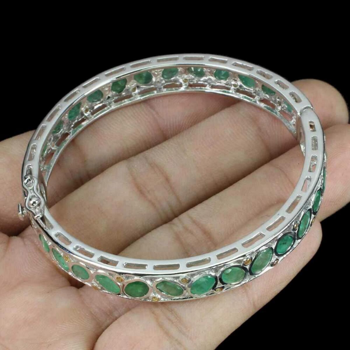 925 STERLING SILVER;PLATE-14K WHITE GOLD;LENGTH -(INCHES)2;MAIN STONE-EMERALD;OTHER GEMS-SAPPHIRE;TOTAL WEIGHT-27.33 GRAM (TOTAL WEIGHT OF SILVER + STONE)DIMENSION-* STONE 1.0 TO 6.0 X 4.0 MM. * DIAMETER 2.0 X 2.0 INCHES. * FACE BANGLE 62.0 X 10.0 MM.;MAIN STONE SHAPE-OVAL CUT;MAIN STONE COLOR-TOP RICH GREEN;TREATMENT-UNHEATED;ORIGIN-COLOMBIA;HARDNESS-7;