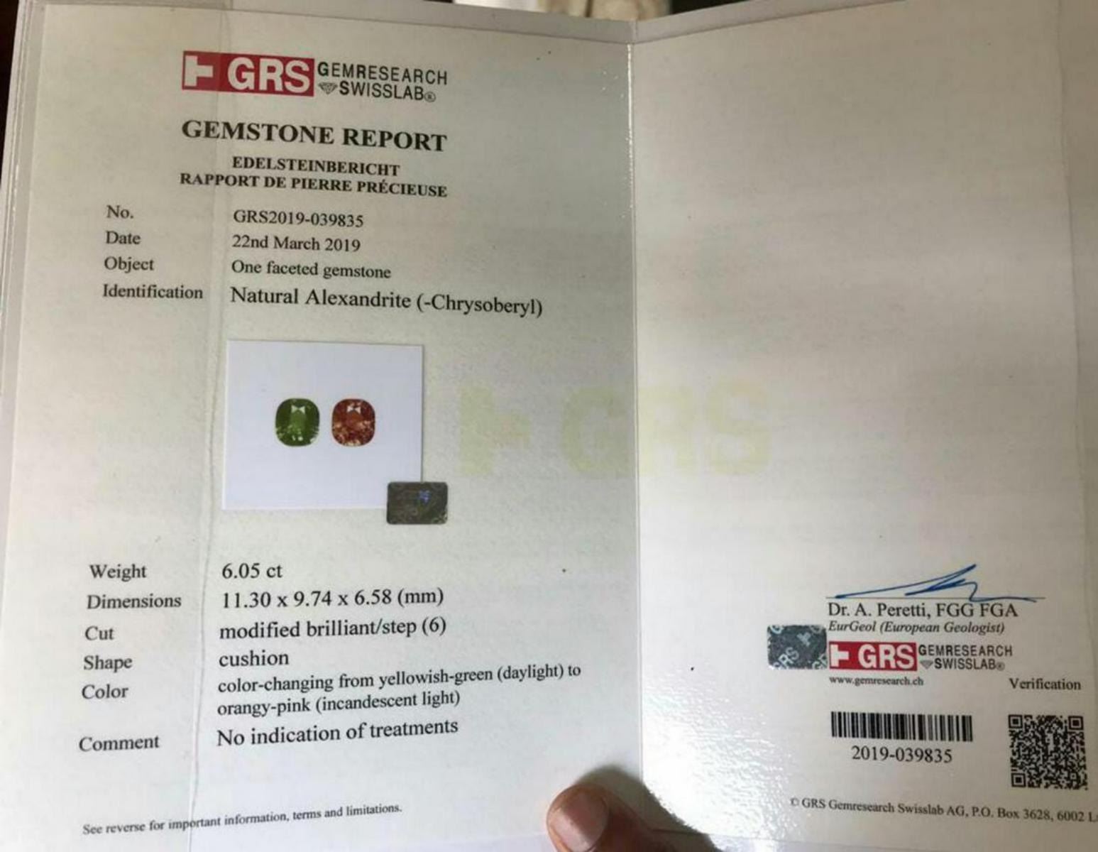 Natural Cushion Alexandrite 6.05 Ct.....classic cushion cut, VS clarity, Origin - Ceylon; Color change from green to Orangy-pink as stated by GRS lab in the certificate.