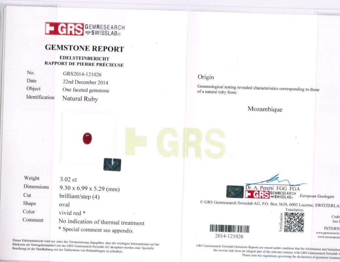 Natural Vivid Red Ruby 3.02 Carats - Flawless...completely untreated....not heated or enhanced in any way....certified by GRS Swiss lab GRS