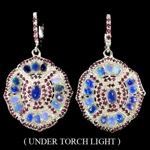 FIRE OPAL & RUBY (NATURAL) 14K WHITE GOLD COATING 925 SILVER EARRINGS;UNIT OF ITEM (S):2 PIECES;WEIGHT (CT.):78.50 CT. (total weight of silver + stone);DIMENSION:* STONE 1.0 TO 6.0 X 4.0 MM. * FACE EARRINGS- 49.0 X 29.0 MM.SHAPE/CUT:OVAL CABOCHON & ROUND FACET;COLOR:WHITE WITH FIRE RAINBOW LUSTER & TOP RICH RED PINK;CLARITY/GRADE:TRANSPARENT;TREATMENT:UNHEATED & HEATED;ORIGIN:ETHIOPIA & AFRICA;HARDNESS:5.5 - 9.0;