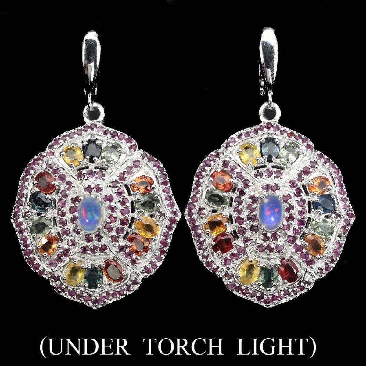 925 STERLING SILVER;PLATE-14K WHITE GOLD;MAIN STONE-FIRE OPAL;OTHER GEMS-RUBY,SAPPHIRE;TOTAL WEIGHT-82.21 CT (TOTAL WEIGHT OF SILVER + STONE)DIMENSION* STONE 1.0 TO 6.0 X 4.0 MM. * FACE EARRINGS 47.0 X 29.0 MM.MAIN STONE COLOR-MULTI-COLOR;CLARITY/GRADE-TRANSPARENT;LUSTER-AMAZING;TREATMENT-UNHEATED;ORIGIN-ETHIOPIA