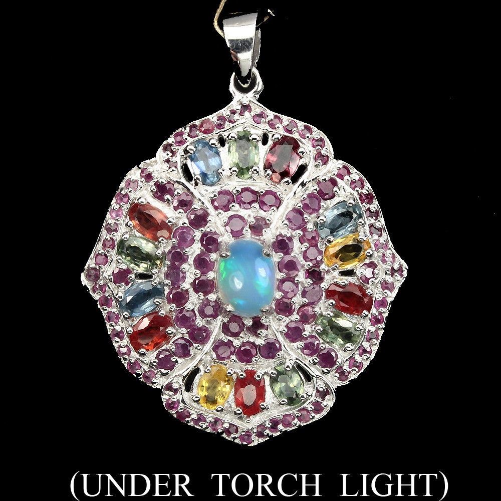925 STERLING SILVER; PLATE -14K WHITE GOLD; MAIN STONE -FIRE OPAL; OTHER GEMS -RUBY,SAPPHIRE; TOTAL WEIGHT 48.49 CT (TOTAL WEIGHT OF SILVER + STONE) DIMENSION * STONE 1.0 TO 8.0 X 6.0 MM. * FACE PENDANT 45.0 X 34.0 MM. ; MAIN STONE COLOR -MULTI-COLOR; CLARITY/GRADE -TRANSPARENT; TREATMENT -UNHEATED; ORIGIN -ETHIOPIA