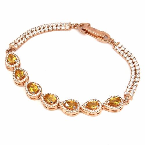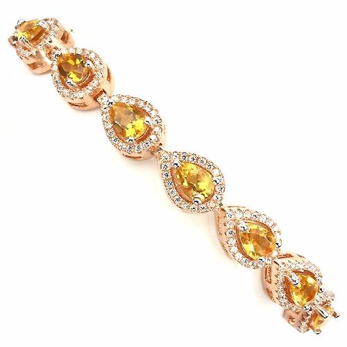 CITRINE (NATURAL) & CUBIC ZIRCONIA 14K ROSE GOLD COATING 925 SILVER BRACELET;WEIGHT (CT.):53.85 CT. (total weight of silver + stone);DIMENSION:* STONE 6.0 X 4.0 MM. * CZ 1.0 TO 2.0 MM. ;* LENGTH 7.0 INCHES. * FACE BRACELET 150.0 X 7.0 MM.;SHAPE/CUT:PEAR FACET & ROUND DIAMOND CUT;COLOR:TOP RICH YELLOW & AAA WHITE;CLARITY/GRADE:IF TO VVS;LUSTER:GORGEOUS;TREATMENT:UNHEATED;ORIGIN:BRAZIL;HARDNESS:7.0