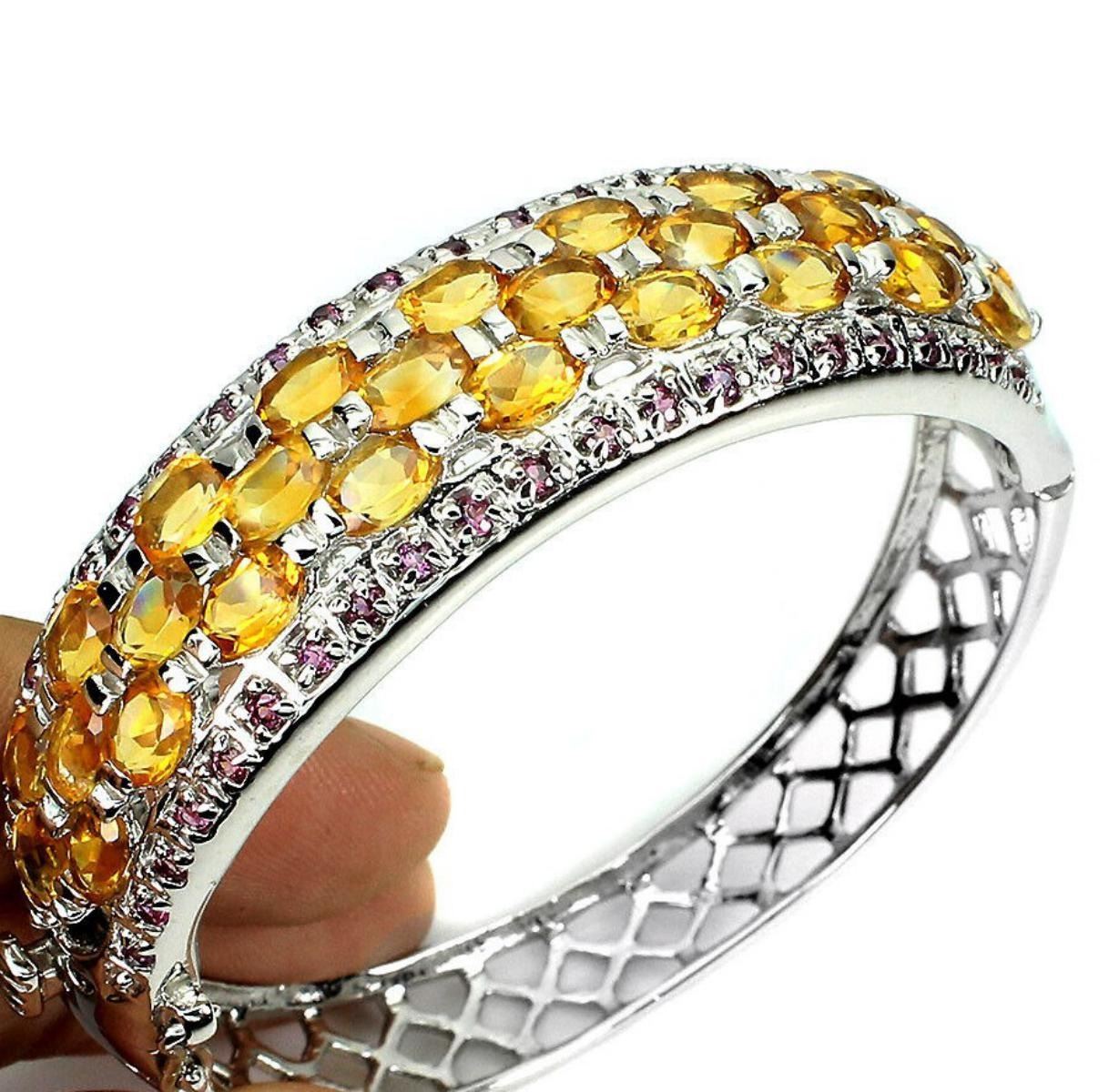 925 STERLING SILVER;PLATE-14K WHITE GOLD;MAIN STONE-CITRINE;OTHER GEMS-RHODOLITE GARNET;TOTAL WEIGHT-29.26 GRAM (TOTAL WEIGHT OF SILVER + STONE)DIMENSION-* STONE 2.0 TO 6.0 X 4.0 MM.;* DIAMETER -1.9 X 2.0 INCHES.;* FACE BANGLE -59.0 X 17.0 MM.;MAIN STONE SHAPE-OVAL CUT;MAIN STONE COLOR- RICH YELLOWCLARITY/GRADE-IF;TREATMENT-UNHEATED;ORIGIN-BRAZIL;HARDNESS-7;