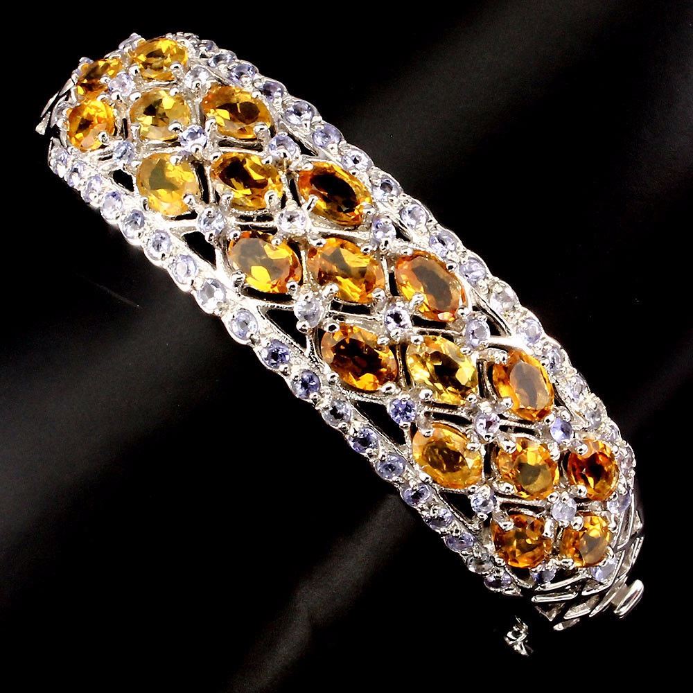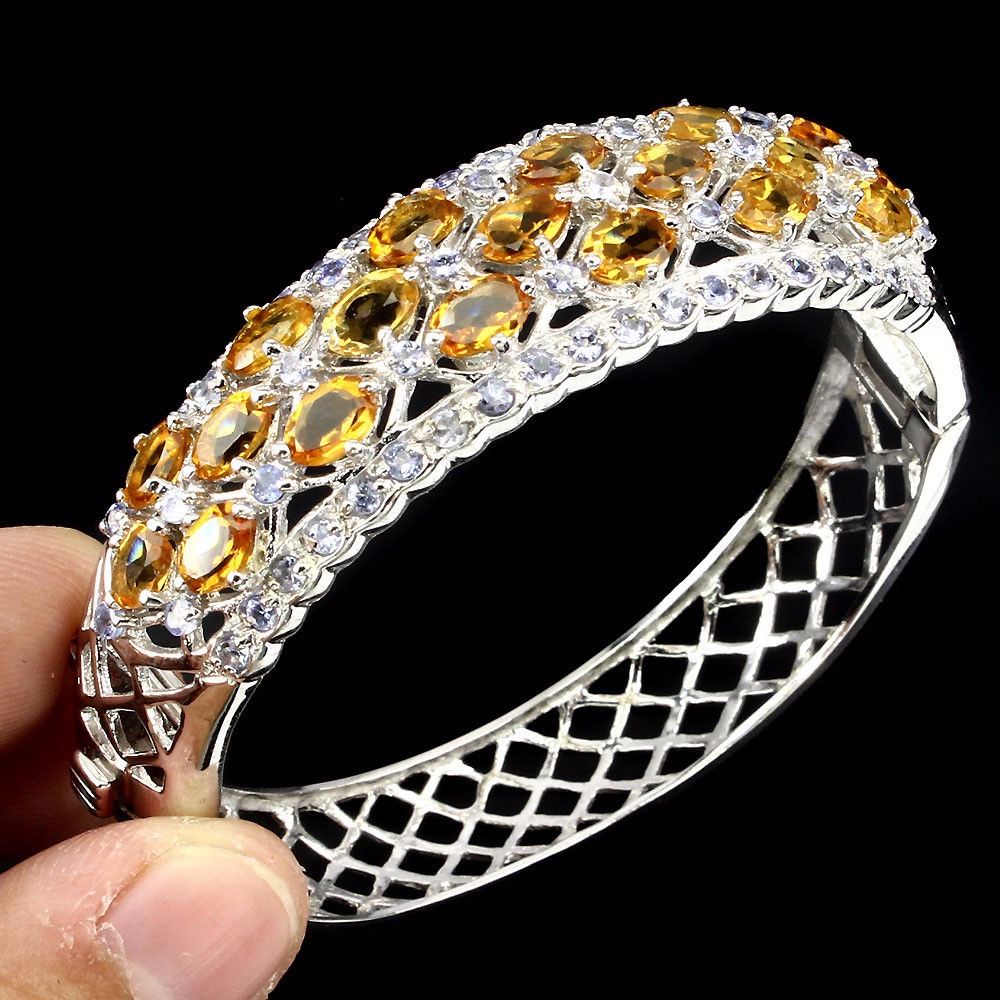 925 STERLING SILVER; PLATE -14K WHITE GOLD; MAIN STONE -CITRINE; OTHER GEMS -TANZANITE; TOTAL WEIGHT -129.41 CT (TOTAL WEIGHT OF SILVER + STONE) DIMENSION * STONE 2.0 TO 6.0 X 4.0 MM. * DIAMETER 1.9 X 1.8 INCHES. * FACE BANGLE 59.0 X 17.0 MM. MAIN STONE SHAPE -OVAL CUT; MAIN STONE COLOR -TOP RICH YELLOW; CLARITY/GRADE -IF TO VVS; LUSTER PRECIOUS; TREATMENT -UNHEATED; ORIGIN -BRAZIL; HARDNESS -7.0