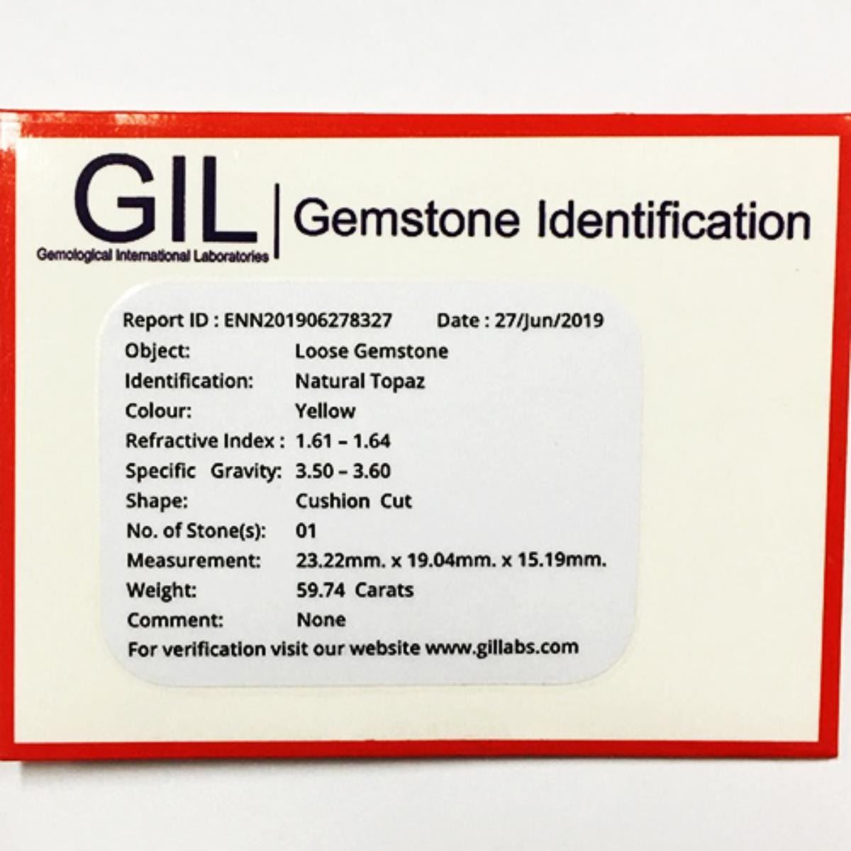 Natural Topaz (Certified) WEIGHT : 59.74 cts; SHAPE : Cushion SIZE ( L x W x D ) : 23.22 x 19.04 x 15.19 mm QUANTITY : 1 piece COLOR : Yellow (Natural Color) CLARITY : Flawless-VVS1  AAA Grade ORIGIN : Brazil HARDNESS : 8 LUSTER : Excellent!!! TREATMENT : Unheated & Untreated 100% Natural