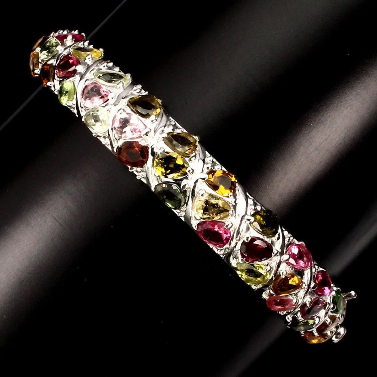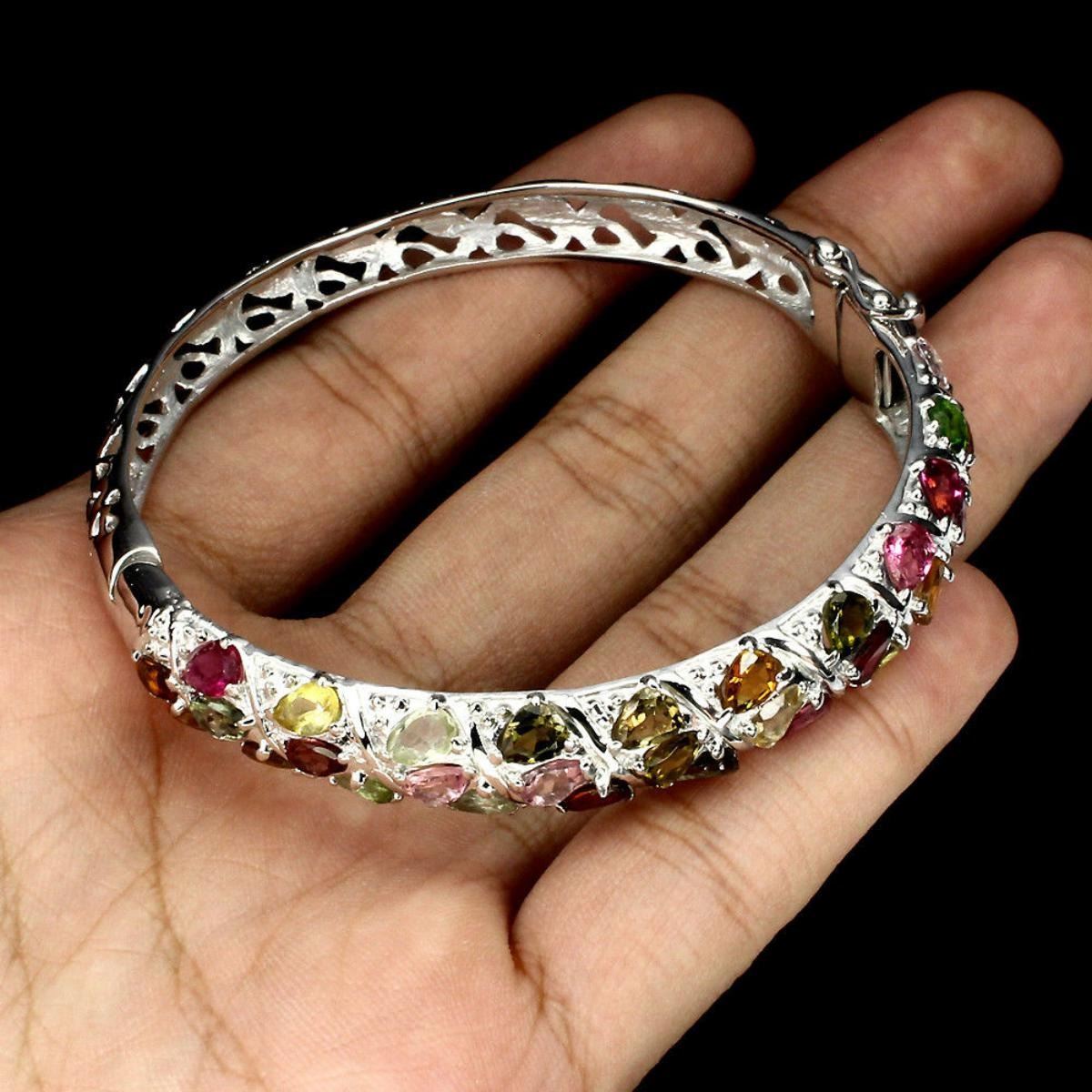 925 STERLING SILVER PLATE 14K WHITE GOLD MAIN STONE TOURMALINE OTHER GEMS TOTAL WEIGHT 127.08 CT (TOTAL WEIGHT OF SILVER + STONE) DIMENSION * STONE 6.0 X 4.0 MM. * DIAMETER 2.4 X 2.3 INCHES. * FACE BANGLE 69.0 X 10.0 MM. MAIN STONE SHAPE PEAR CUT MAIN STONE COLOR MULTI-COLOR CLARITY/GRADE IF TO VVS LUSTER MESMERIZING TREATMENT UNHEATED ORIGIN BRAZIL HARDNESS 7.0 - 7.5