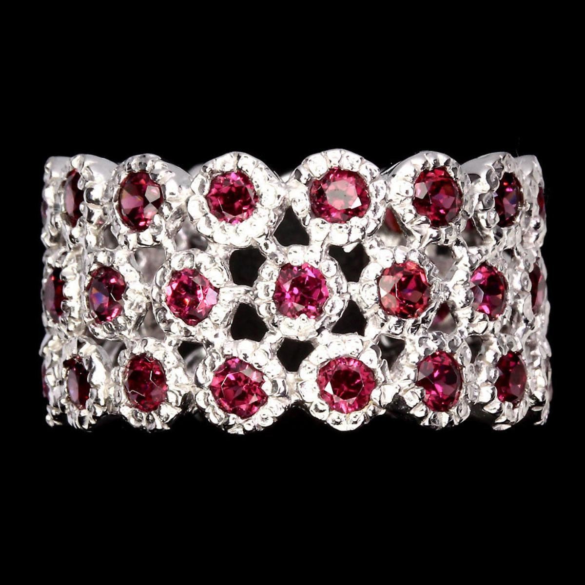 925 STERLING SILVER; PLATE 14K WHITE GOLD; RING SIZE 8; MAIN STONE RHODOLITE GARNET; TOTAL WEIGHT 26.24 CT (TOTAL WEIGHT OF SILVER + STONE) DIMENSION * STONE 3.0 MM. * FACE RING 22.0 X 12.0 MM. MAIN STONE SHAPE ROUND CUT; MAIN STONE COLOR TOP RICH PINK RASPBERRY; CLARITY/GRADE IF TO VVS; LUSTER ELEGANT; TREATMENT UNHEATED; ORIGIN AFRICA; HARDNESS 7.0 - 7.5;
