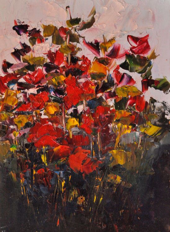 Artist: Robert Tompkins.  Title: Nature's Complements, by Robert Tompkins.  Size: 12" x 16".  Description: "I used a palette knife with thick paint to achieve depth, and complementary colors moving to either side of the complement.  I took a painterly approach to this piece."