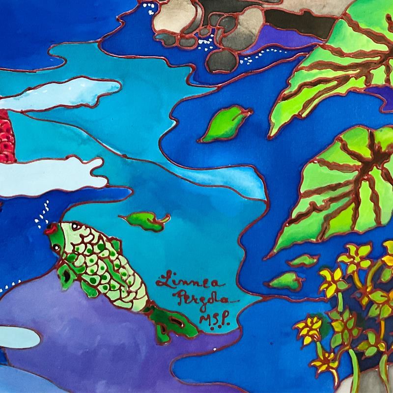 "Nature's Symphony" is an original painting on silk, by Linnea Pergola. The piece is hand signed by the artist, framed, and comes with a letter of authenticity. Measures approximately 57" x 39" (framed), 54" x 36" (image).