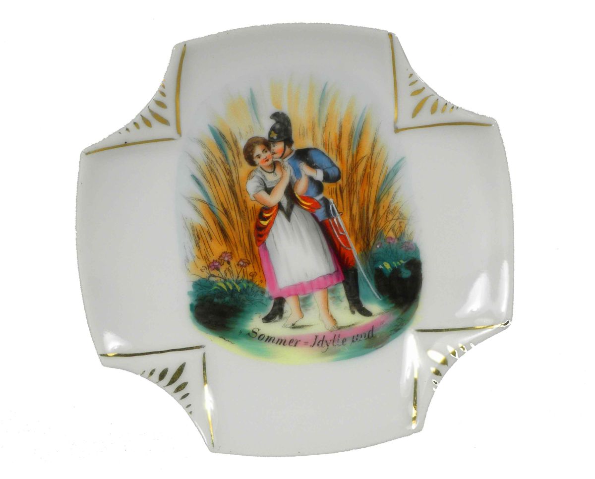 Naughty Porcelain Plate, depicts soldier with woman in a grass field. Entitled, "Sommer = Jdylle Und". Reverse side reveals bottom of feet in precarious position. No chips or cracks, excellent condition. 5 X 5 inches.