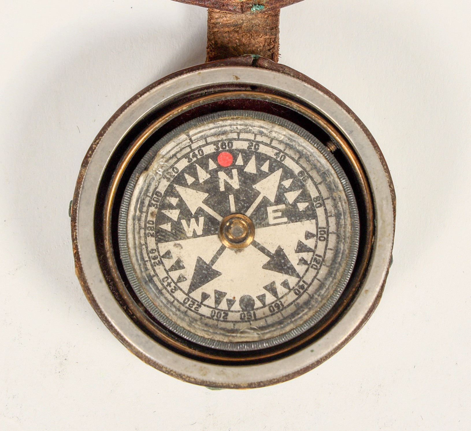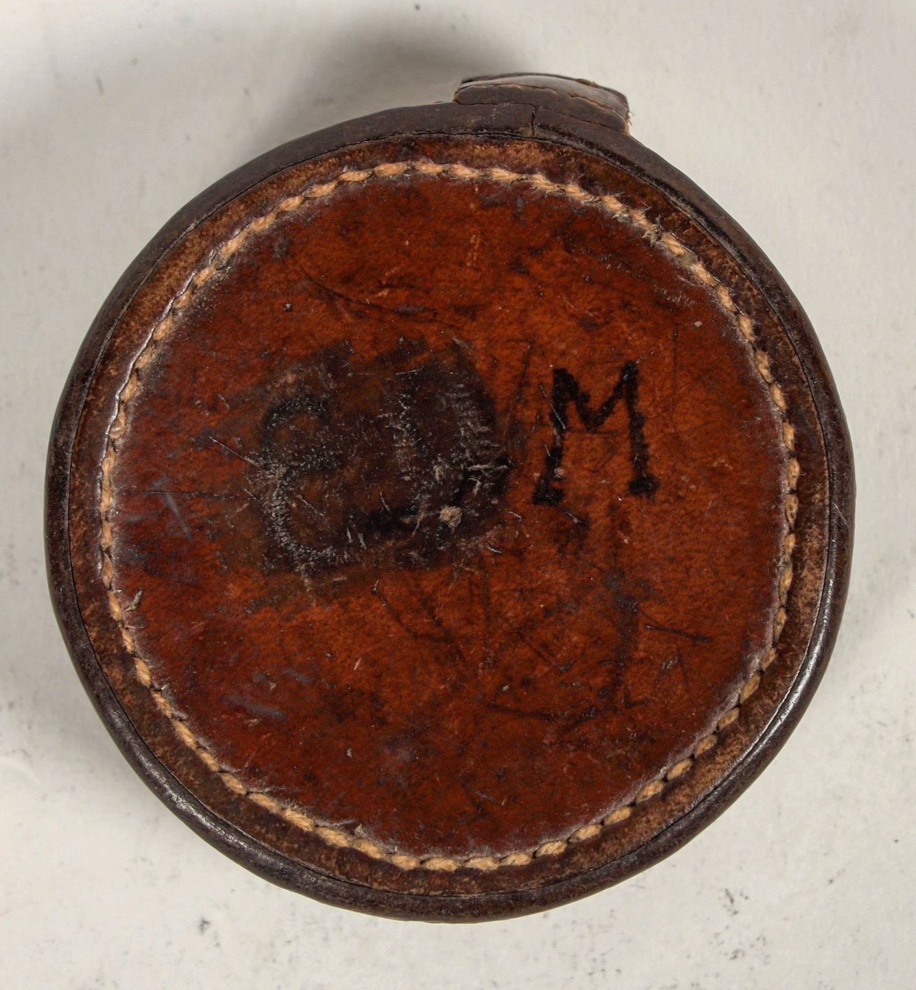 This is a nautical compass that has been gimbled in a leather/steel case. There are instructions on the inside cover to illuminate the card. In working order, however the gimble pins to the case are missing in action. In very good condition. 2.25 in. in diameter. c. 1890. Please see photos for details.