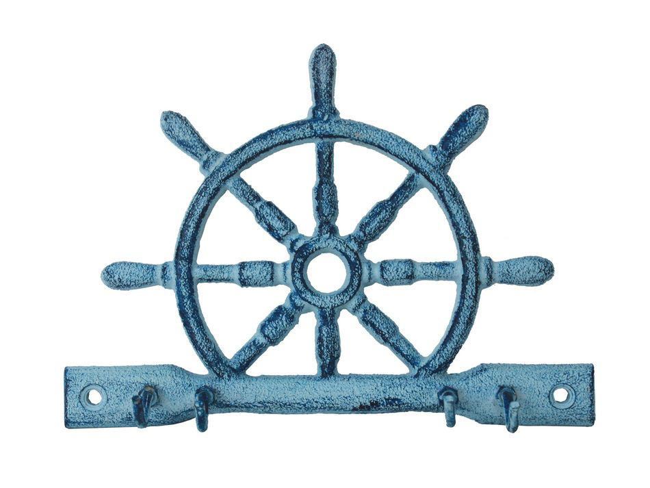 Nautical Rustic Dark Blue Whitewashed Cast Iron Ship Wh **|**|** Nautical Rustic Dark Blue Whitewashed Cast Iron Ship Wheel with Hooks 8"