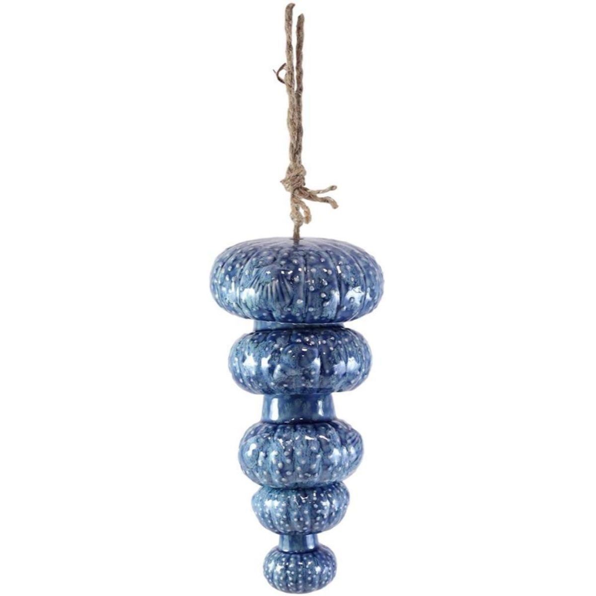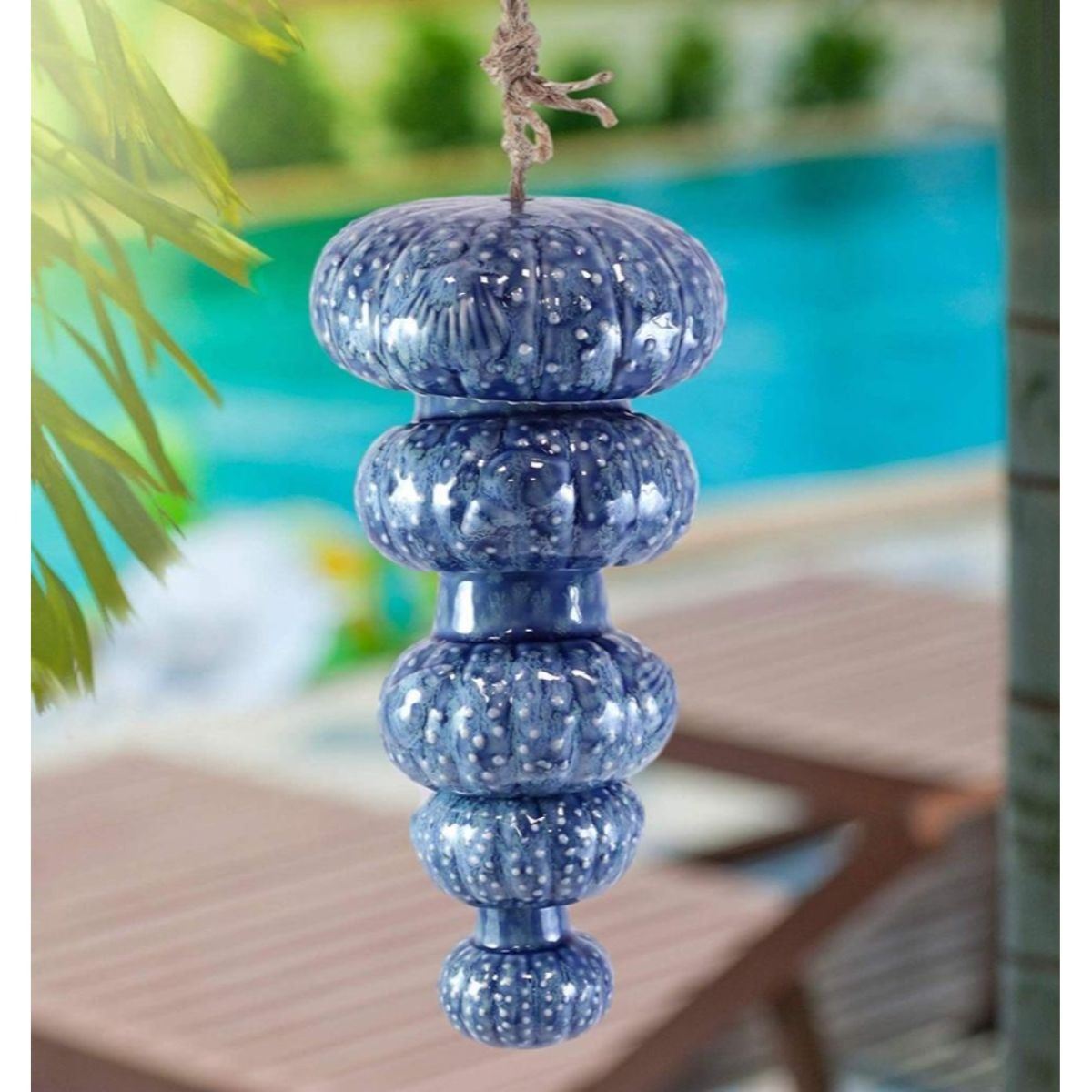 Nautical theme beach house, pool & patio stylized jellyfish ceramic mobile wind chime. Hand-painted with patterned sea urchins, starfish, shells. Â