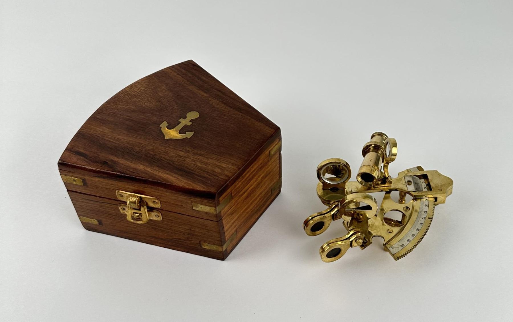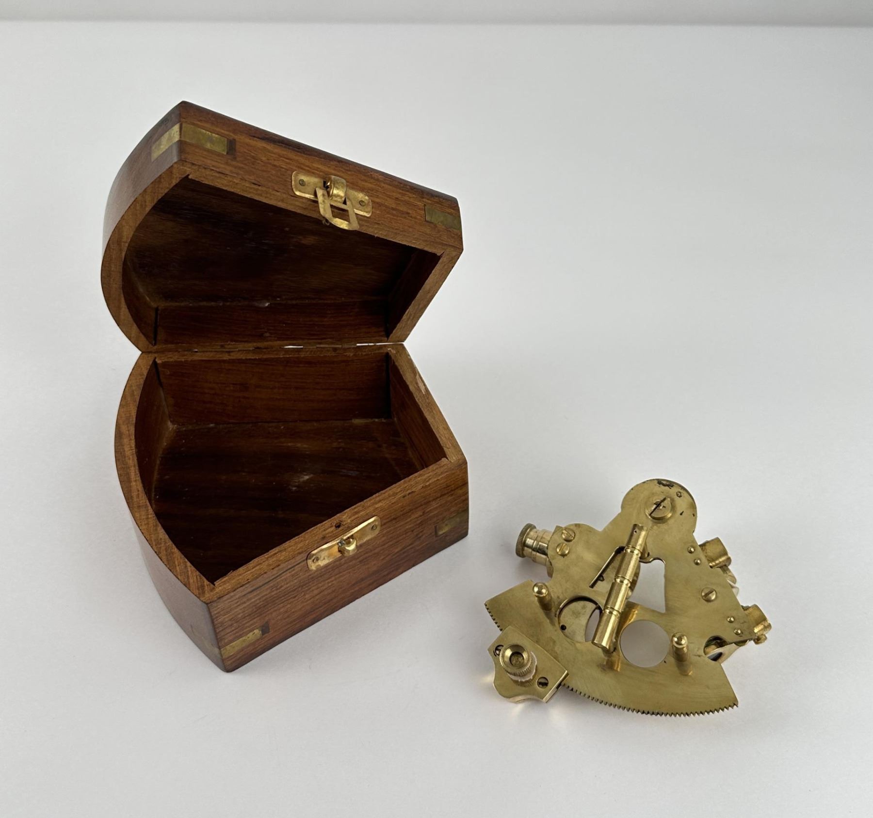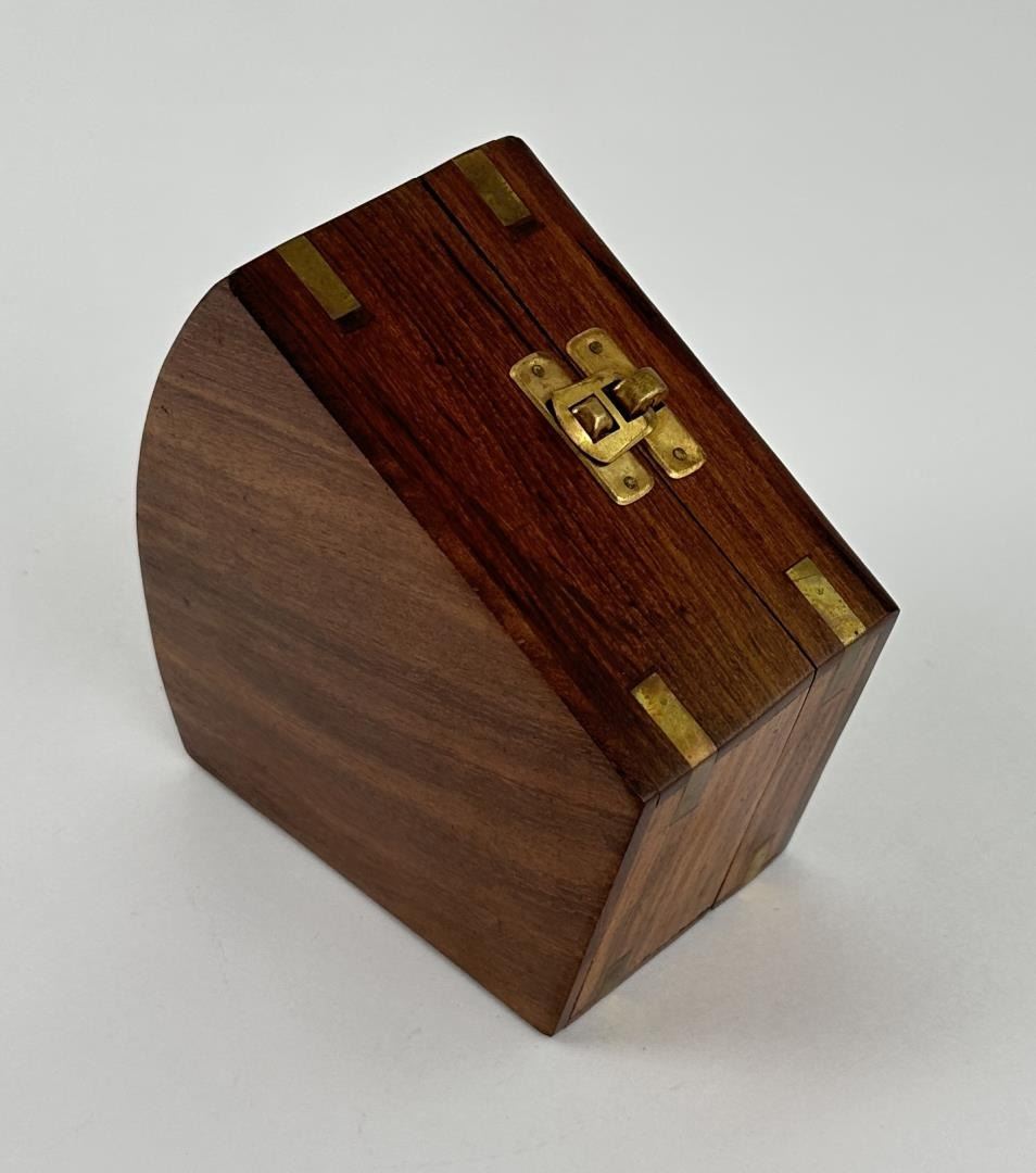 Case measures 5 1/2" by 5" and is 2 3/4" high. Reproduction in wood box.