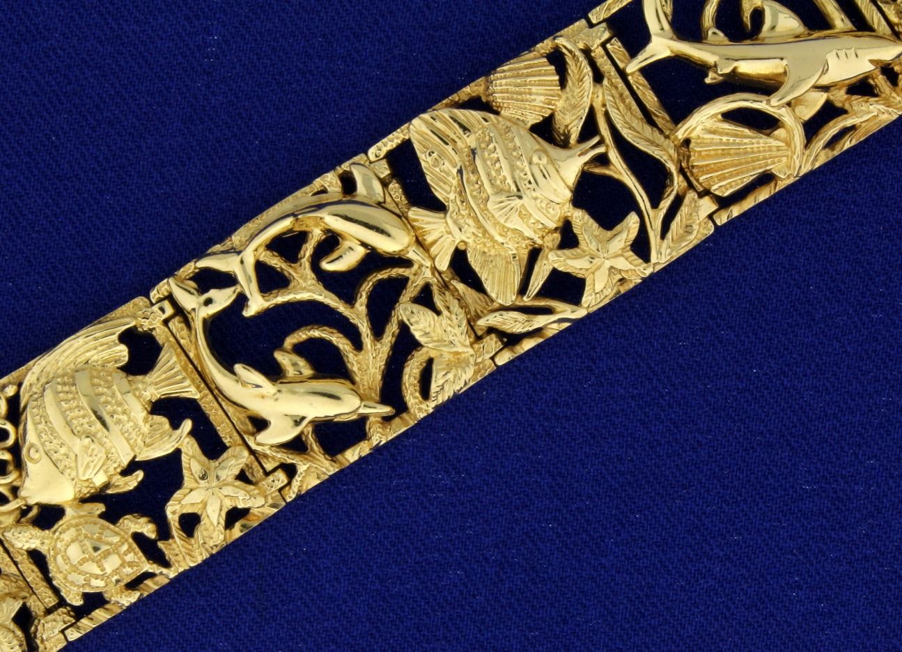 In 14k yellow gold. 7" long and 19.7mm wide with safety clasp. 41.9g.