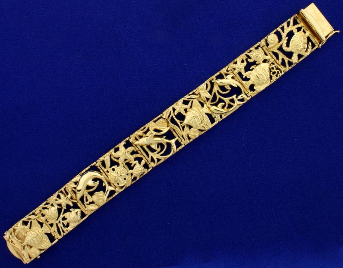 In 14k yellow gold. 7" long and 19.7mm wide with safety clasp. 41.9g.