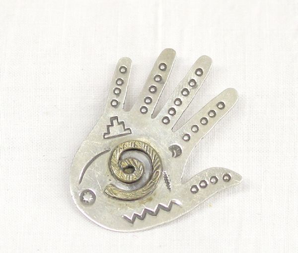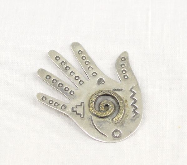 Navajo Sterling Gold Filled Hand Pin by Wil, measures 1 11/16'' x 1.5'', marked Wil Sterling 1/20 12KT G.F., hand stamped, features life spiral in palm of hand, hand stamping includes bear, water wave, sun, and stairstep cloud