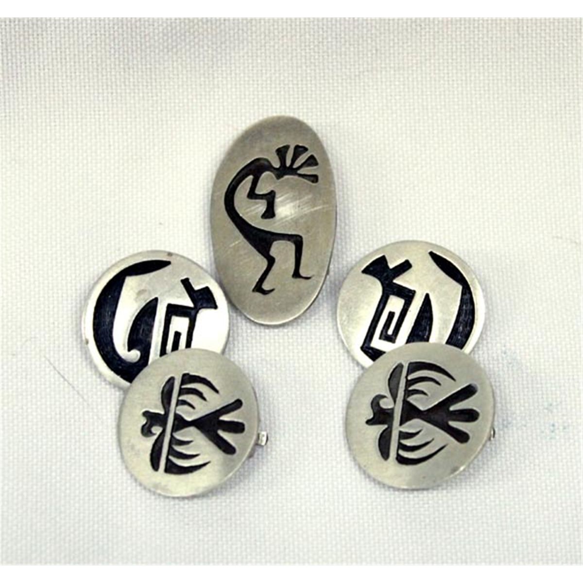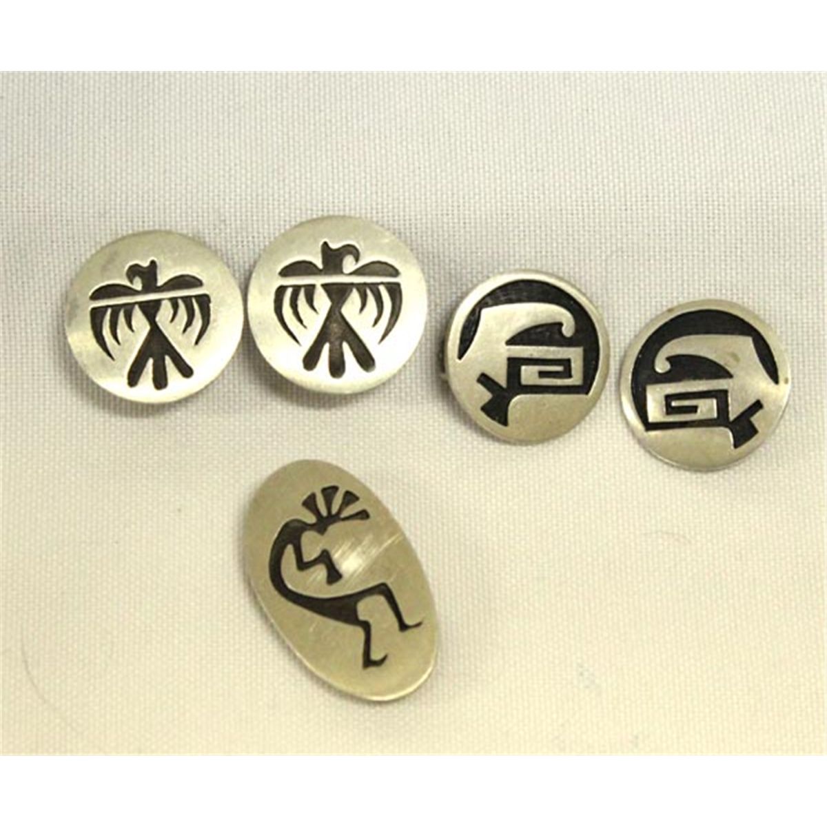 Native American Navajo 2 Pair Clip Etched Earrings and 1 Pin/Pendant. Brushed silver color metal with etched figures. Pendant is 1.25''x0.75'' and earrings are 7/8'' diameter. Kokopelli & Thunderbird. Buyers Pay Actual Shipping and Handling Charges(see terms and conditions for more information).