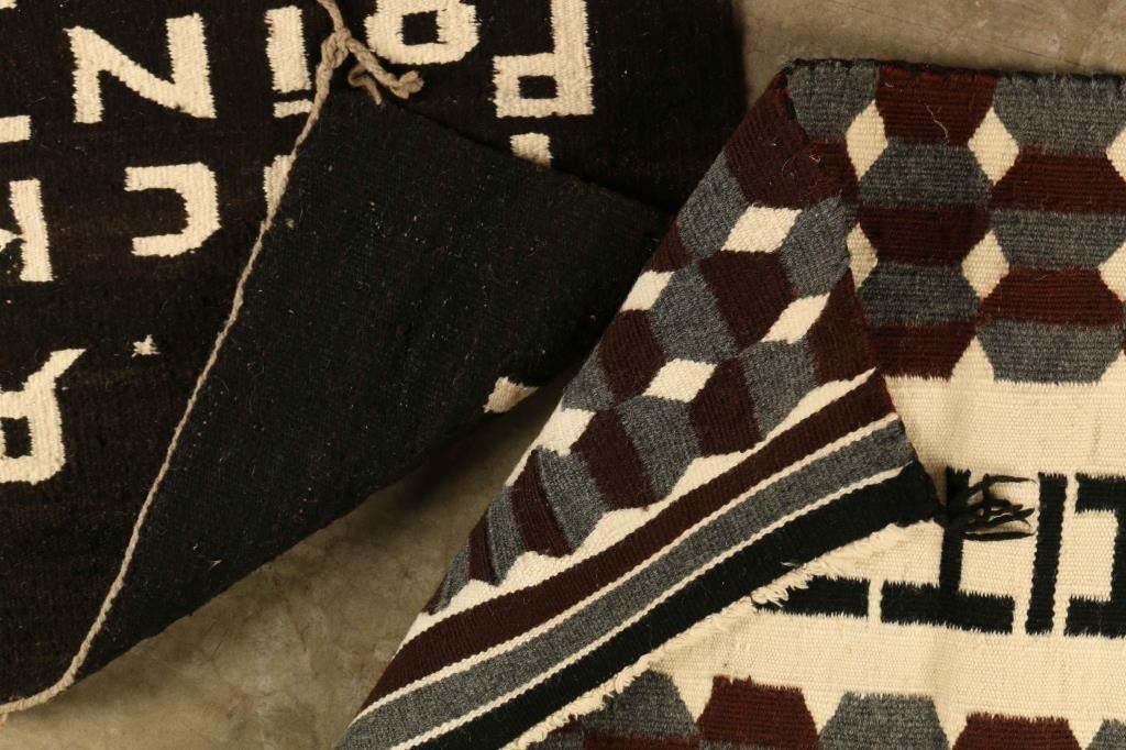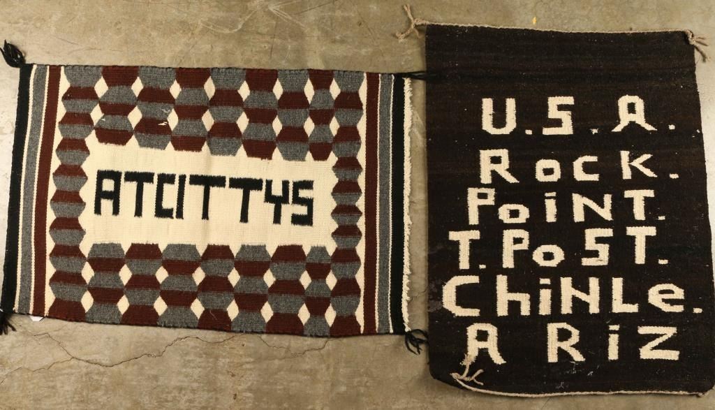 (1) Rug with squares with center reads Atcittys. 28"X18" (1) Black rug with white lettering reads USA Rock Point T. Post Chinle Ariz 25"X20"