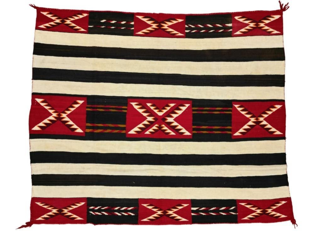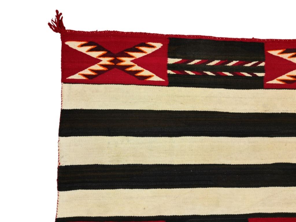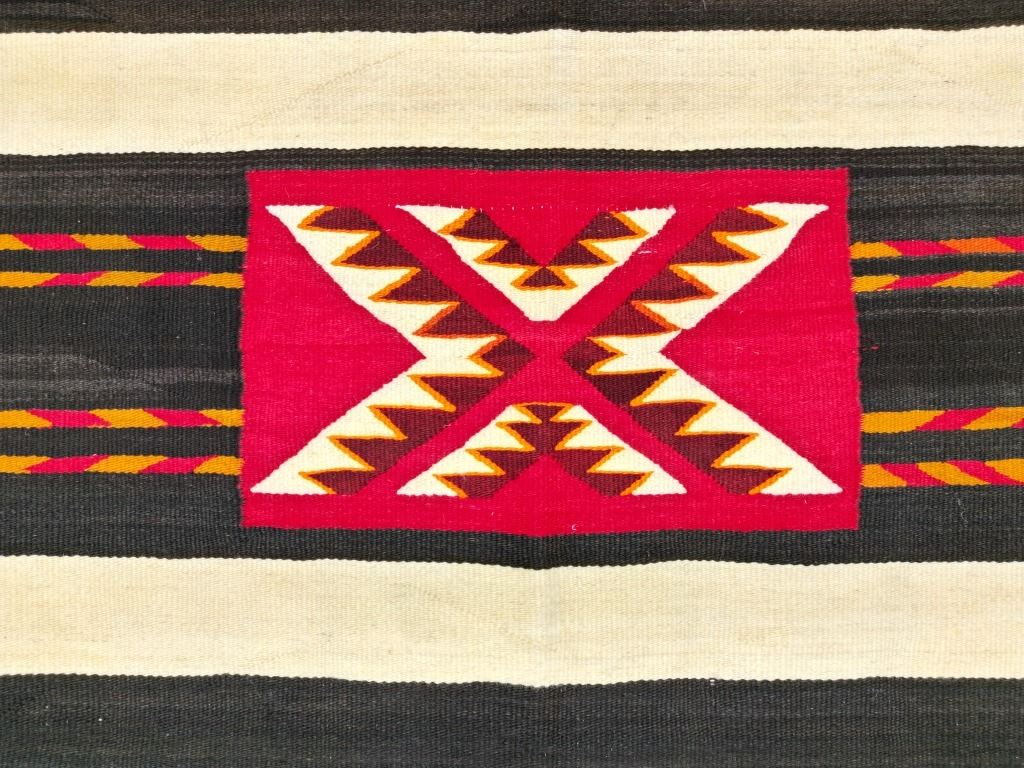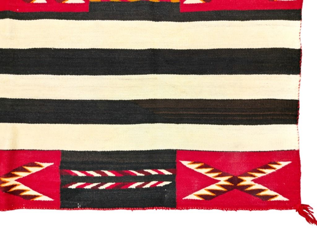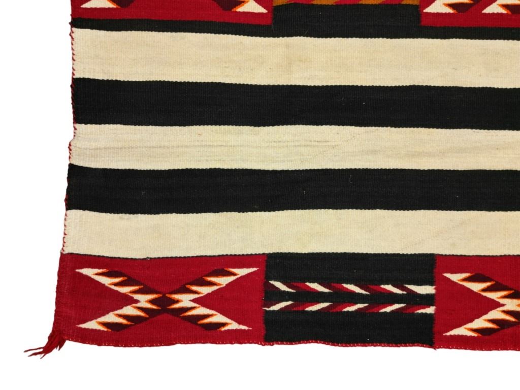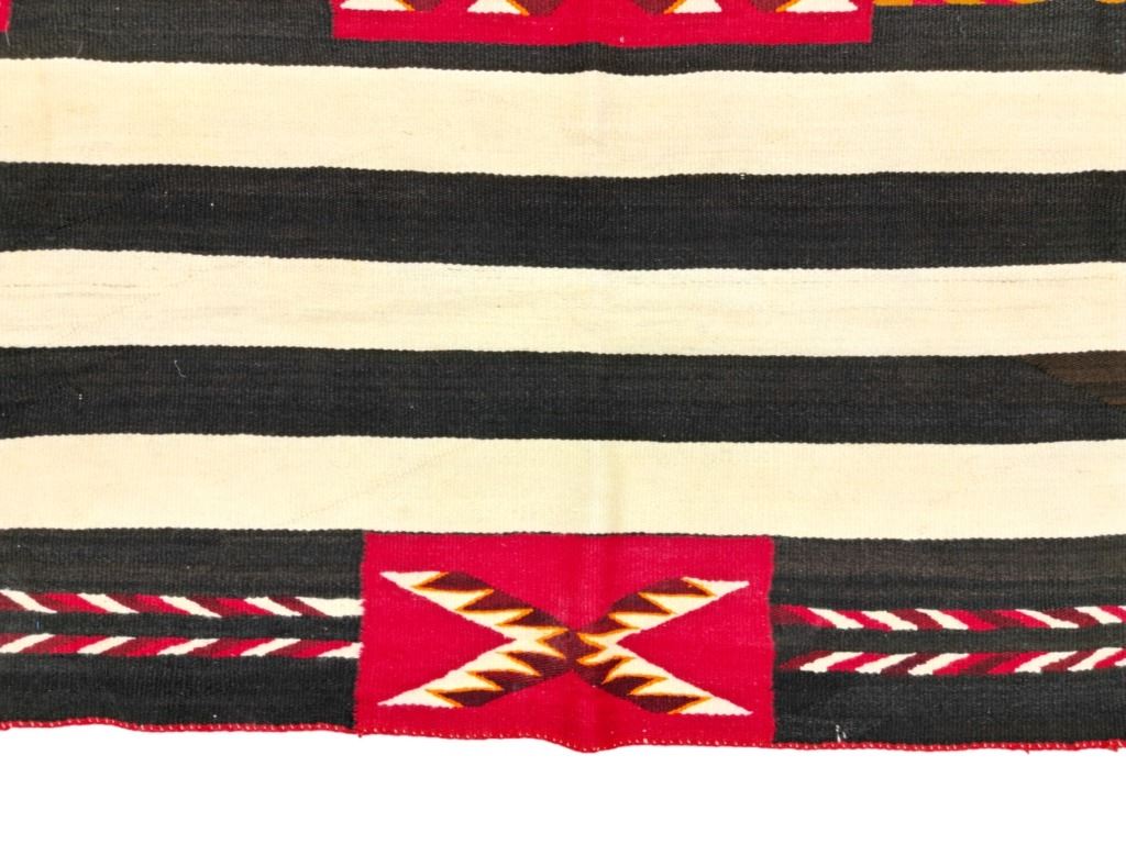 This is a fantastic, authentic late1800's to early 1900 Navajo Transitional Second Phase Chief’s Blanket from the ex-March in Montana and ex-Private Bozeman collections with Red Mesa style accents. The piece was found to be an authentic example at the experts at March in Montana, Coeur d’Alene Galleries and The Coeur d’Alene Art Auction where it was sold for over $8,000. This is truly a stunning piece with fine wool that shows a Red Mesa pattern with bands of off-white and black in classic 2nd Phase Chief’s pattern set off with dazzler “X” stepped patterns. The blanket is beautifully done and one of the highlights of the sale. The condition of this of this Navajo Chief's Blanket shows no a/b sides. One area where warp is visible near one end, but is as woven, not thinning. Two pea-sized light stains visible, isolated to one side. Overall excellent. The measurements of this Chief's blanket 6 foot 4 inches by 5 foot 6 inches. Provenance: Found to be an authentic example by the experts at March in Montana, Coeur d’Alene Galleries and The Coeur d’Alene Art Auction where it was sold for over $8,000; from a private high-end Native American collection in Bozeman, Montana who purchased from only the best houses such as Sotheby’s, Bonhams, Skinners, Cowans, March in Montana, North American Auction Company.