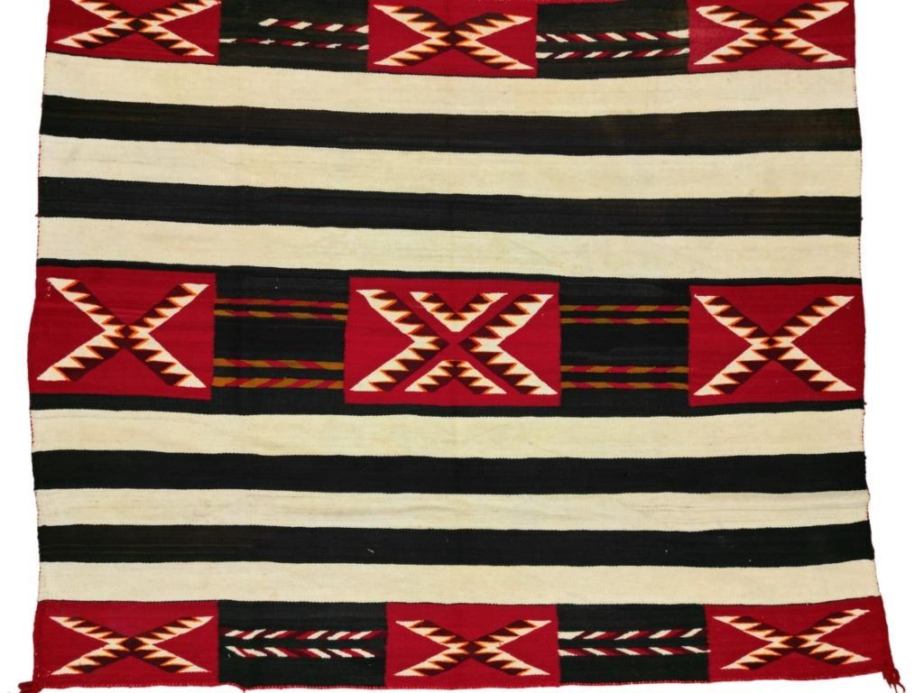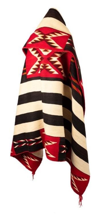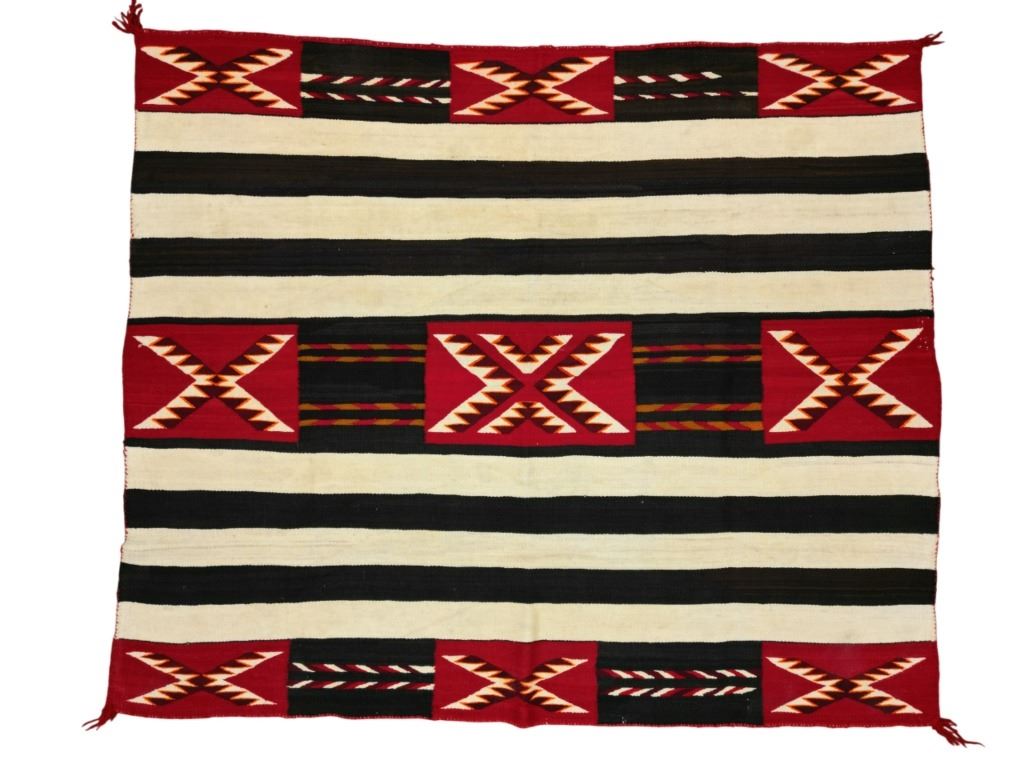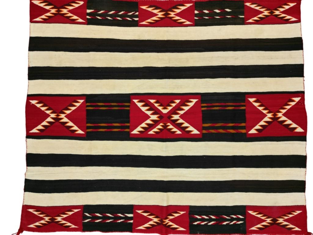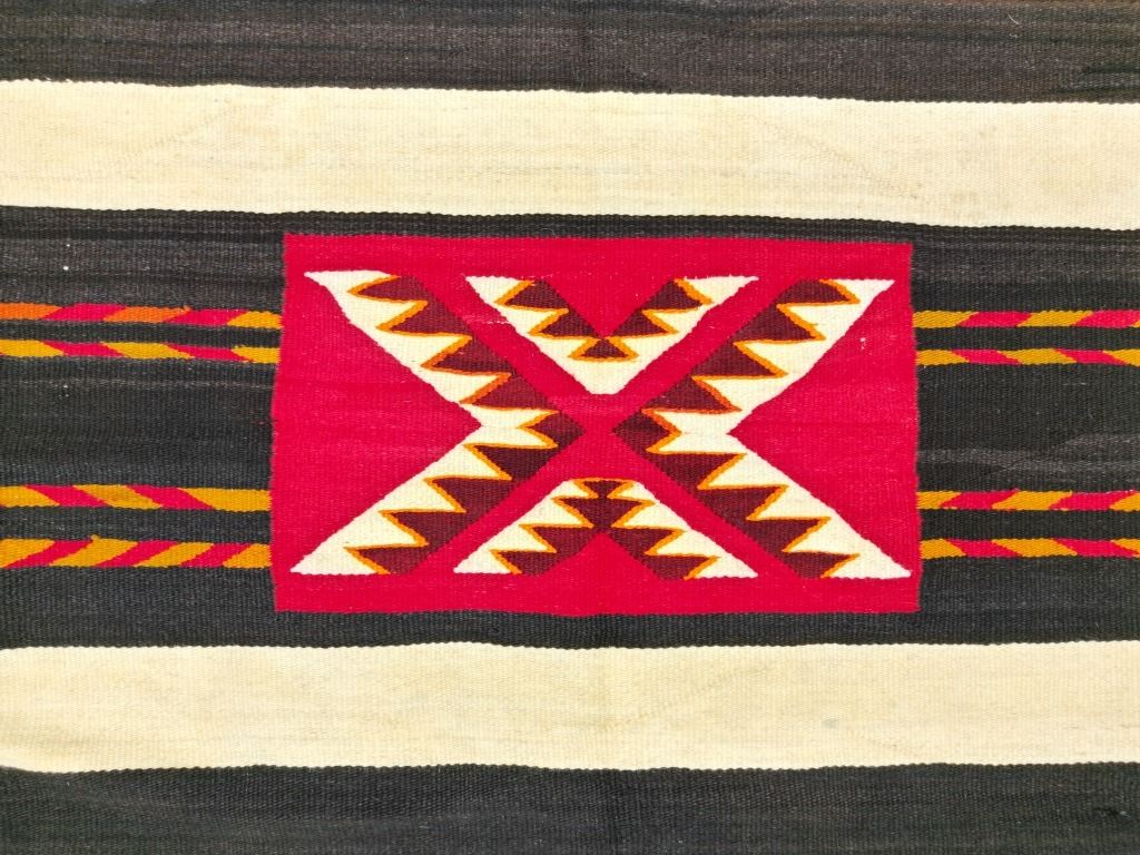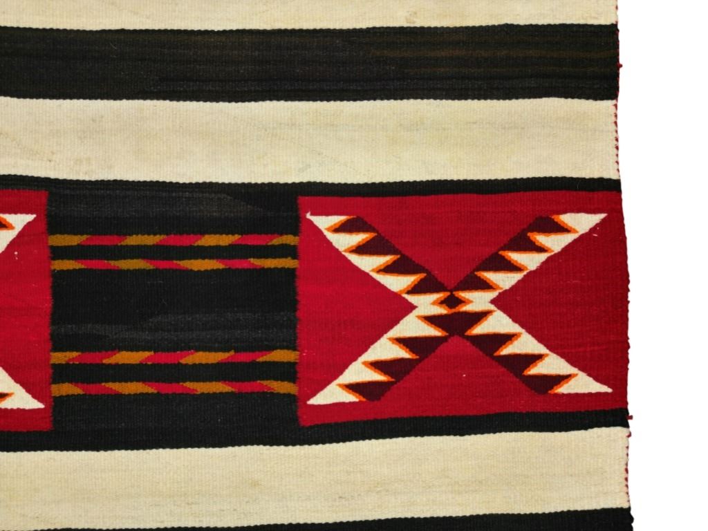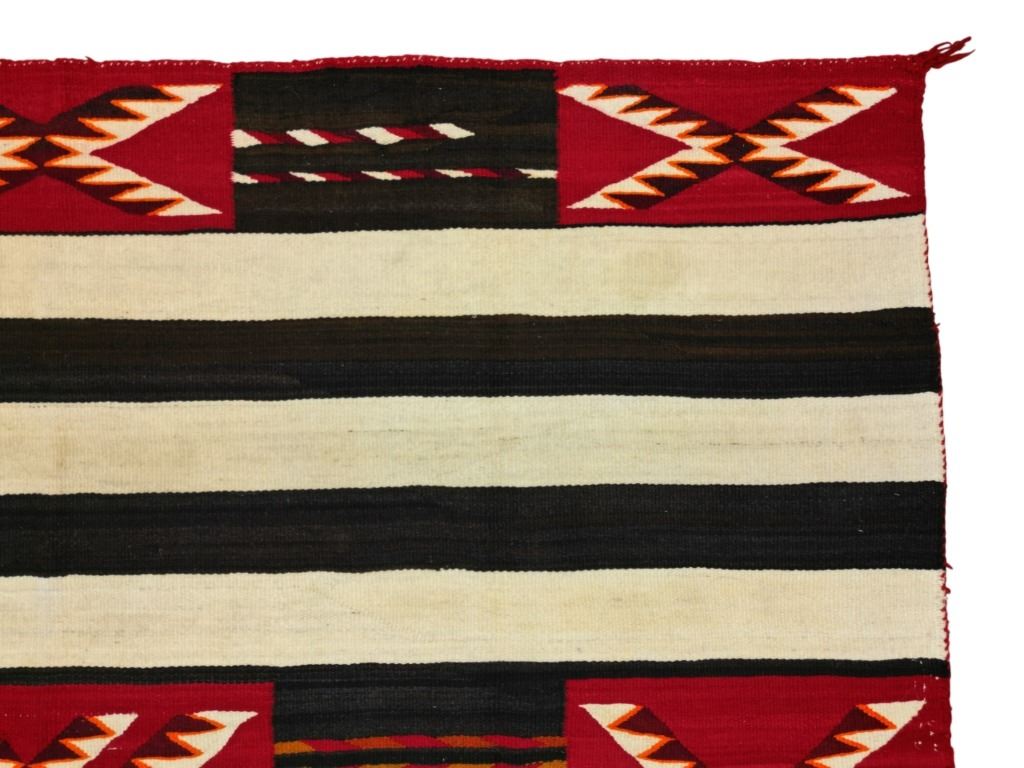 This is a fantastic, authentic late1800's to early 1900 Navajo Transitional Second Phase Chief’s Blanket from the ex-March in Montana and ex-Private Bozeman collections with Red Mesa style accents. The piece was found to be an authentic example at the experts at March in Montana, Coeur d’Alene Galleries and The Coeur d’Alene Art Auction where it was sold for over $8,000. This is truly a stunning piece with fine wool that shows a Red Mesa pattern with bands of off-white and black in classic 2nd Phase Chief’s pattern set off with dazzler “X” stepped patterns. The blanket is beautifully done and one of the highlights of the sale. The condition of this of this Navajo Chief's Blanket shows no a/b sides. One area where warp is visible near one end, but is as woven, not thinning. Two pea-sized light stains visible, isolated to one side. Overall excellent. The measurements of this Chief's blanket 6 foot 4 inches by 5 foot 6 inches. Provenance: Found to be an authentic example by the experts at March in Montana, Coeur d’Alene Galleries and The Coeur d’Alene Art Auction where it was sold for over $8,000; from a private high-end Native American collection in Bozeman, Montana who purchased from only the best houses such as Sotheby’s, Bonhams, Skinners, Cowans, March in Montana, North American Auction Company.