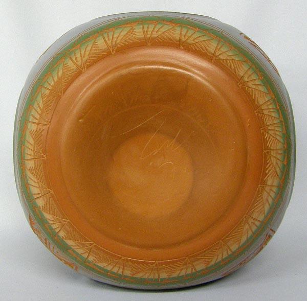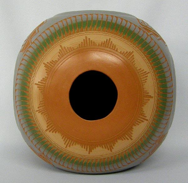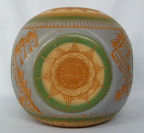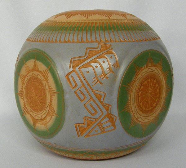 Navajo 4 Corners Etched Pottery Signed. Measures approx. 10''H x 9'' x 9''. SHI $40.