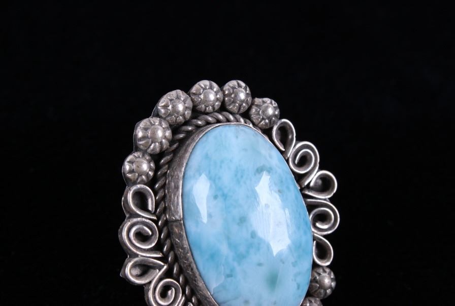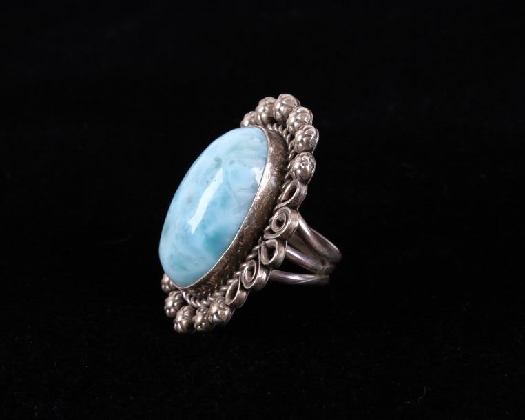 For your consideration is a Navajo Native American Allison Johnson Larimar sterling silver ring. Larimar is a semi-precious stone with its own cache of best kept secrets. This is an extremely rare precious stone that has only been found in one very small location on the planet, a remote mountain range of the Dominican Republic in the Caribbean. It is believed that an earthquake had shaken the mountains caused the hidden gems to dislodge and tumble into the local river. The two explorers who happened up the stone decided to call the beautiful stone larimar, a name that combined the Dominican explorer’s daughter’s name, Larissa, with the word Mar, the Spanish word for sea. A unique name for a unique stone. The unique color and patterns within larimar are the result of mixing and cooling that occurred as the stone formed. As a result of the unique minerals and cooling process during crystallization each piece has unique color and patterning. This stunning ring features a large cabochon of polished Larimar. The stone is expertly set on a sterling silver base. The base is heavily stamped and features a braided rope border. The ring itself is composed of a three band design. The underside of the ring is stamped “Sterling” and features the artist Alice Johnson’s hallmark. The ring measures a US size 7.