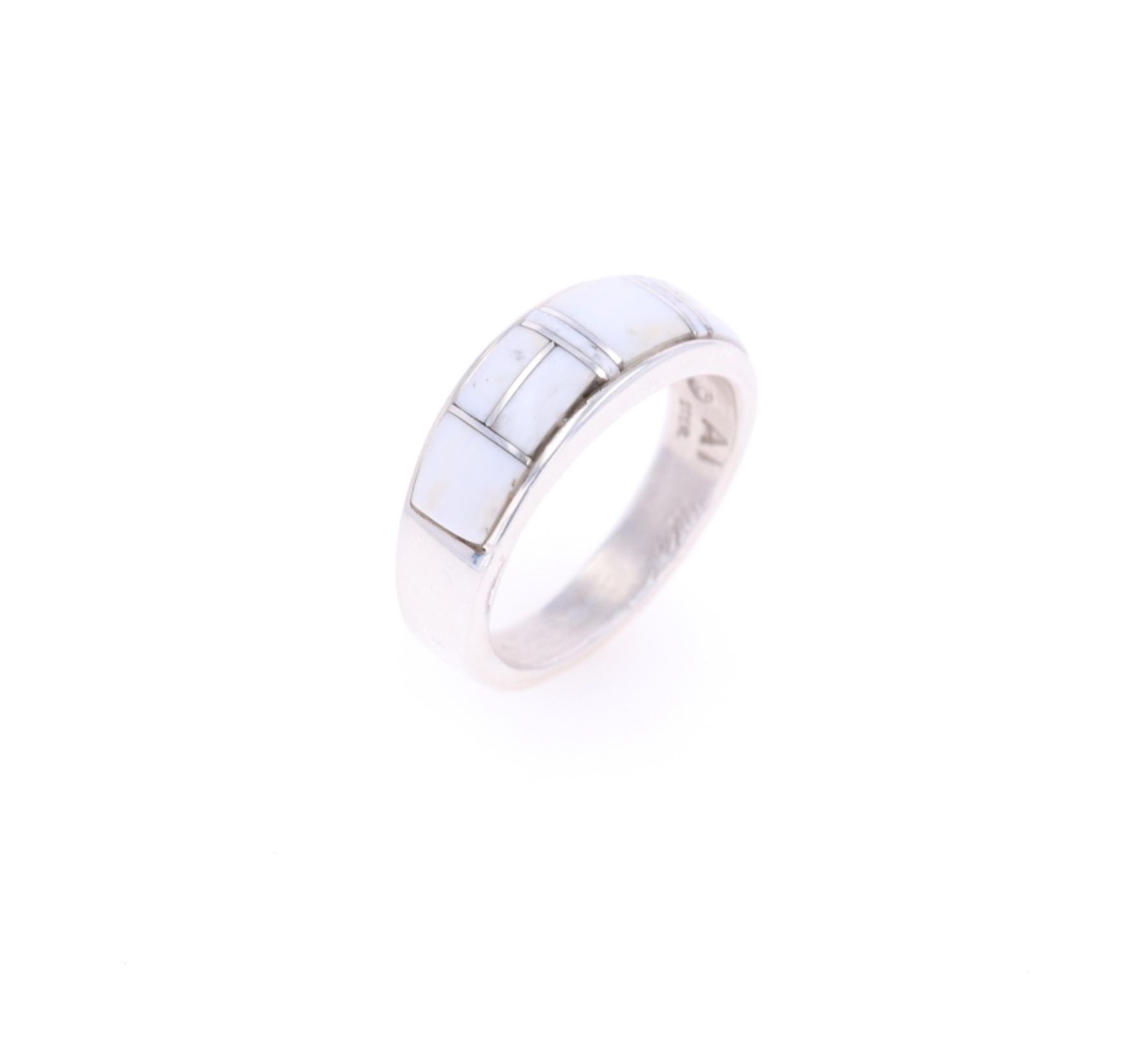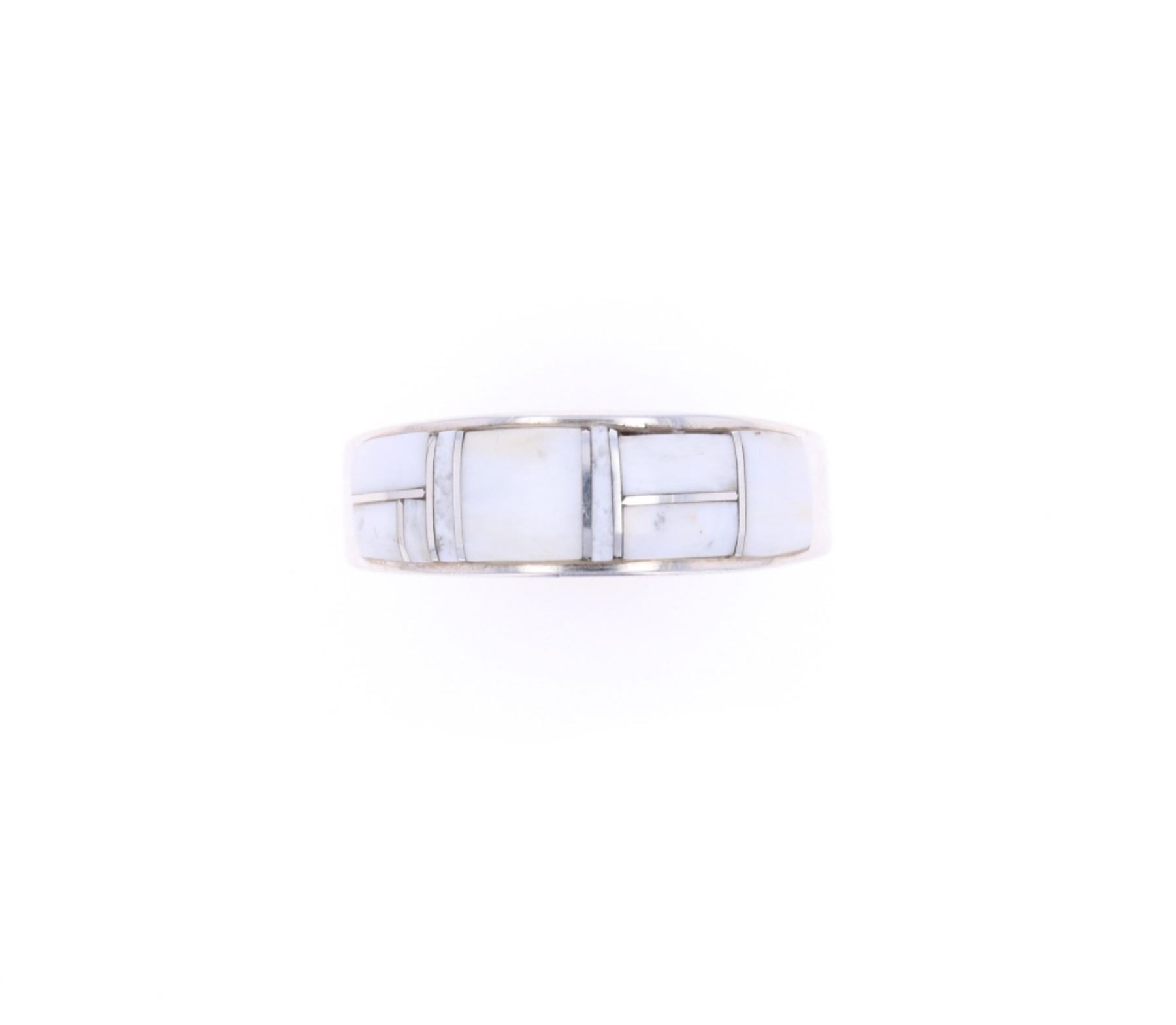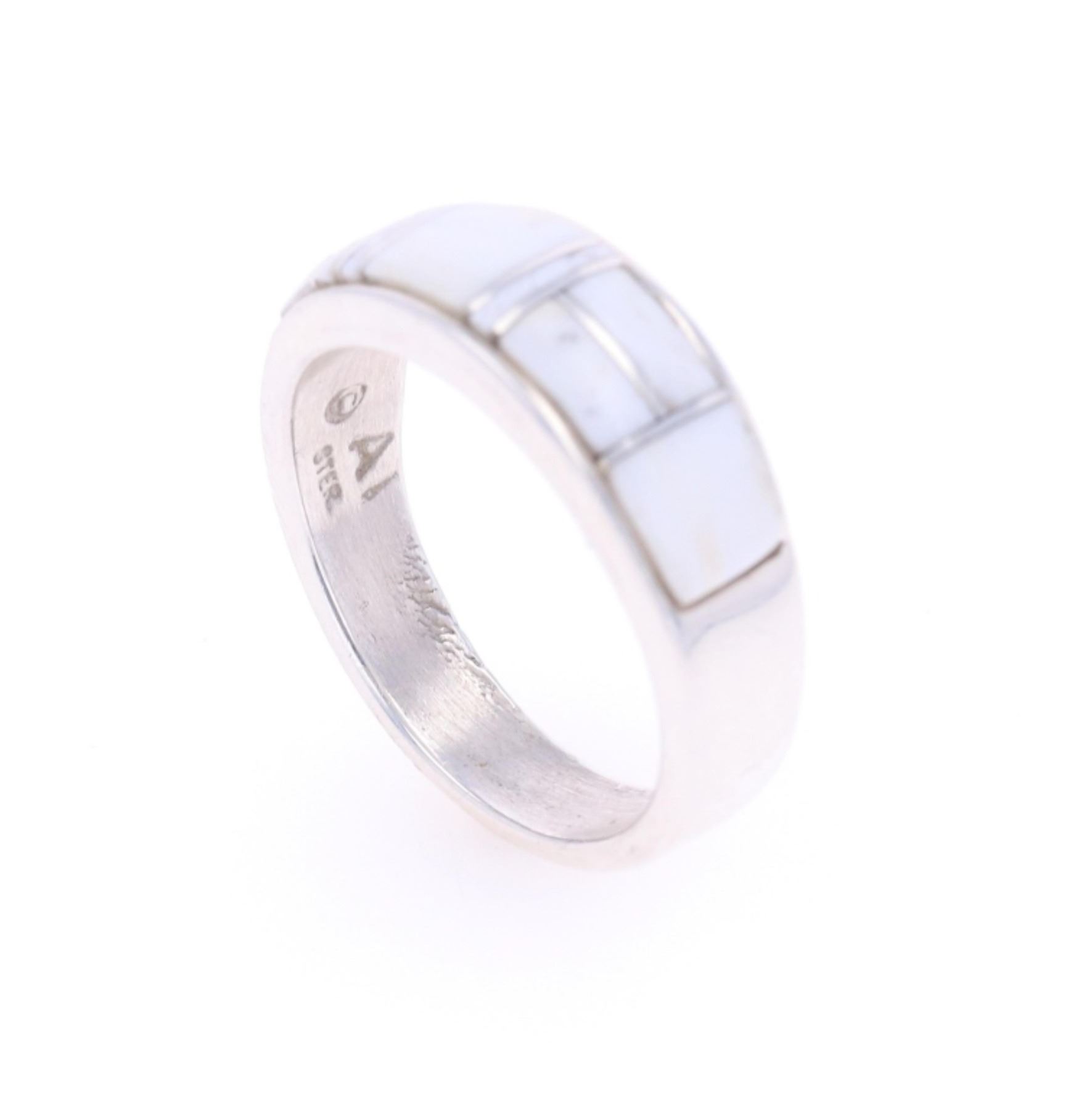 Featured in this lot is this sterling silver and white buffalo turquoise ring from Navajo artist Angie Tom. The ring features a wonderfully and professionally crafted sterling silver construction that shows a semi mosaic inlay of white buffalo turquoise cabochon set into the face. The ring is marked as follows: AT - Ster. The condition of this Navajo ring is good with no obvious signs of damage and shows good overall condition. The overall measurements of this ring is 1" x 1" x 3/8" and the ring size is US 11 1/2. The collective weight of this ring is 8.5g.